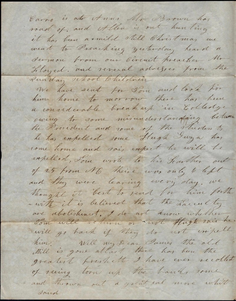 Churchill drafted the letter during the Holiday Season of 1830 in Wilmington, North Carolina, as indicated by the content and postal markings. While he does not disclose the specifics of his long-term assignment, it is evident that it pertained to military service, as he included the “Private” sheet directed to Griswold amidst what was likely official correspondence. He notes that his family was safely settled at Fort Johnson—a historic Revolutionary War fort situated on the Clinch River near Wilmington. His assignment may have been connected to Fort Caswell, which was under construction during that period. He hints at some fear of being “kilt dead by nigs” which explains why he kept his family at Fort Johnson. I’m not aware of any particular slave revolt at that time but, in general, there was a constant fear among slave owners throughout this period of slave uprisings as the slaves greatly outnumbered the white inhabitants. As a Northerner, his presence among a large slave population may have heightened his anxiety.