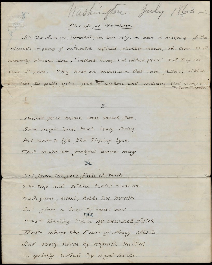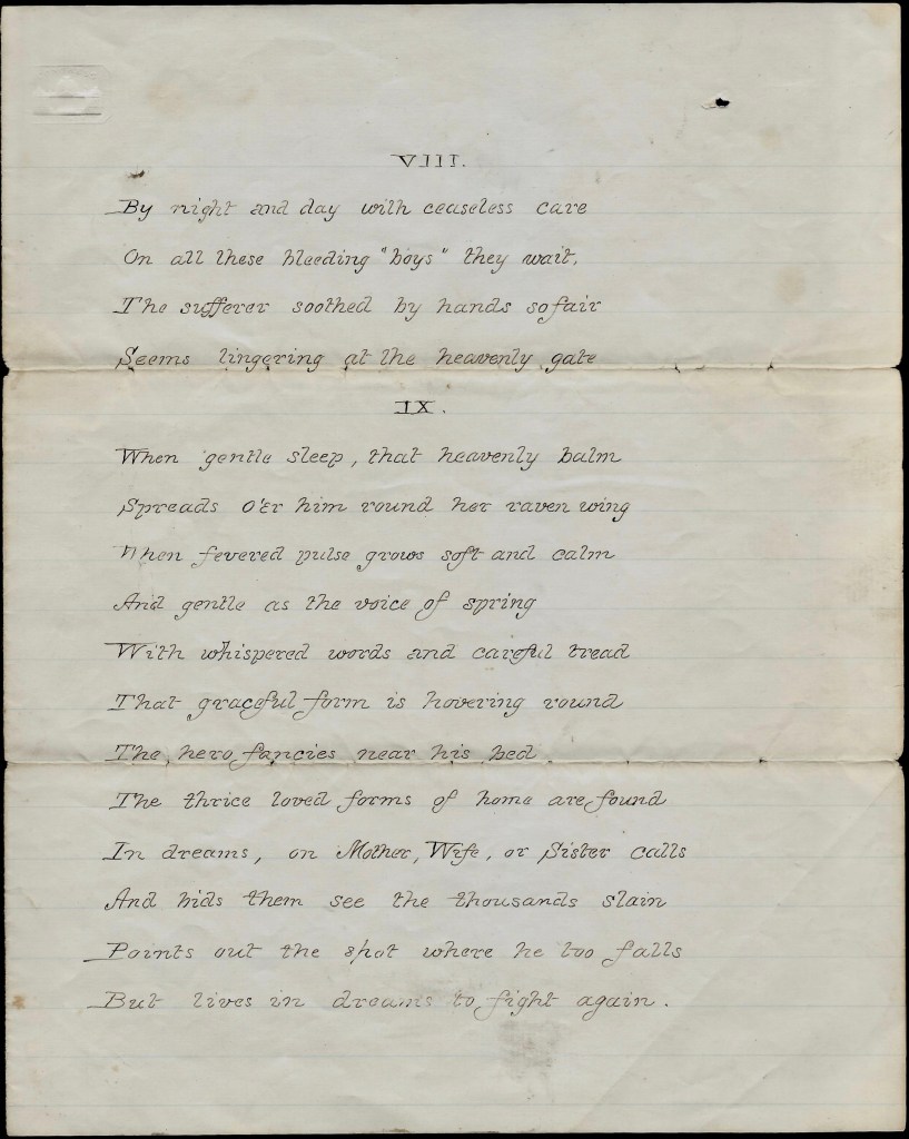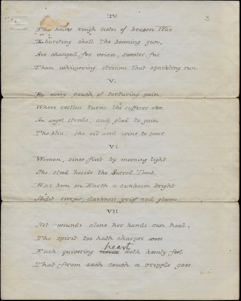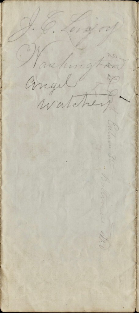 Mary Ann, as Dan was writing, I thought I would write you a few lines. I do not know what to think about Daniel for sometimes he seems real smart and then he appears to be quite bad, but all I can do is to hope for the best. I wish he was at home. He longs to be with his friends. Oh, I hope he may soon. I do not dare to let him know how unhappy I am, but try to appear gay and lively. I am almost discouraged. Should be quite if I did not have so many kind friends to encourage me. I have a very good place at Roscoe’s. They are very kind indeed. She is a lovely woman. She does a great deal for the soldiers. Write soon, — Angie