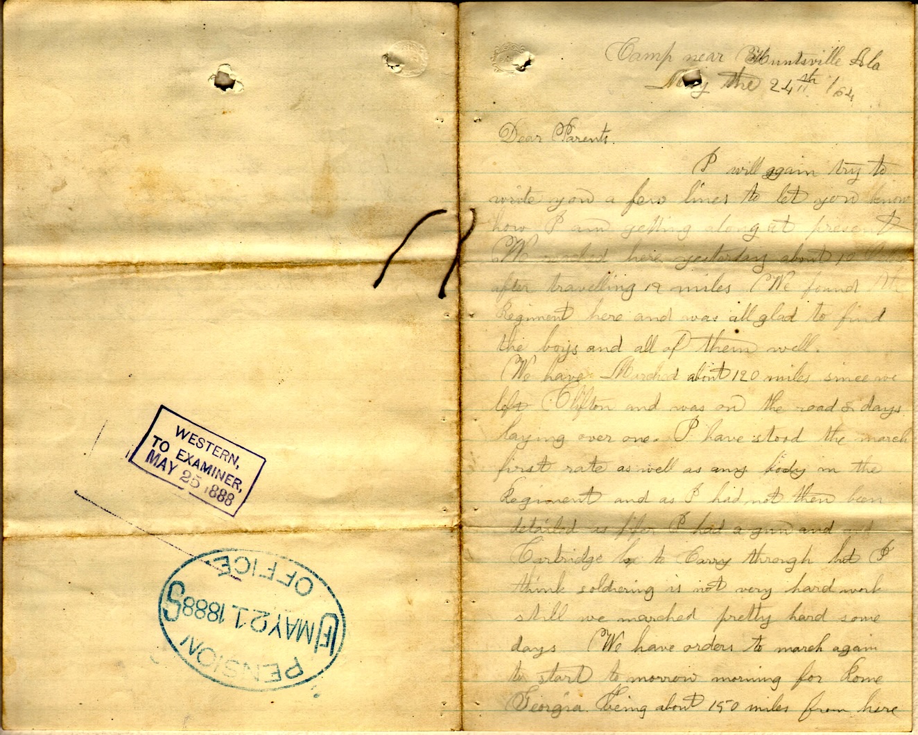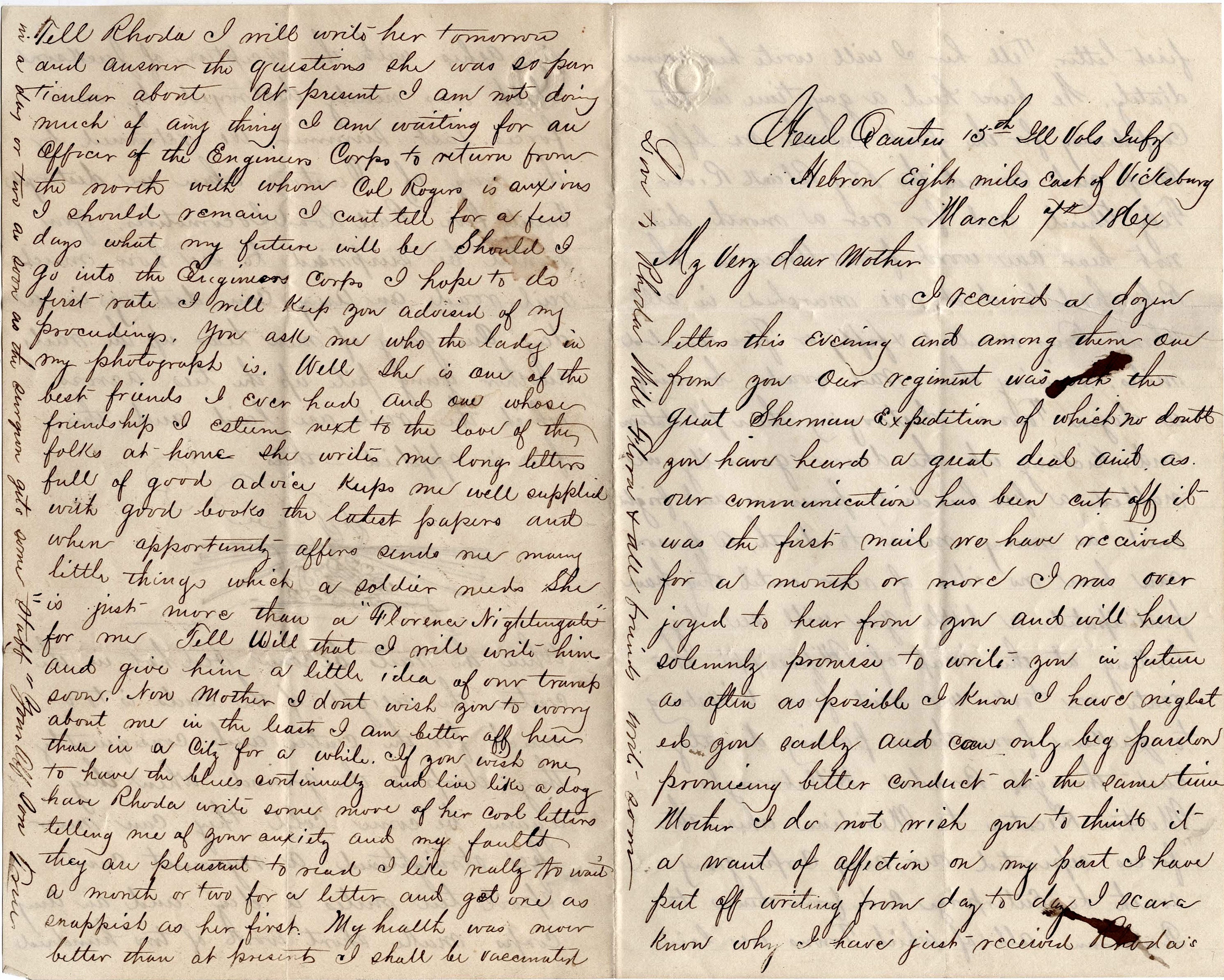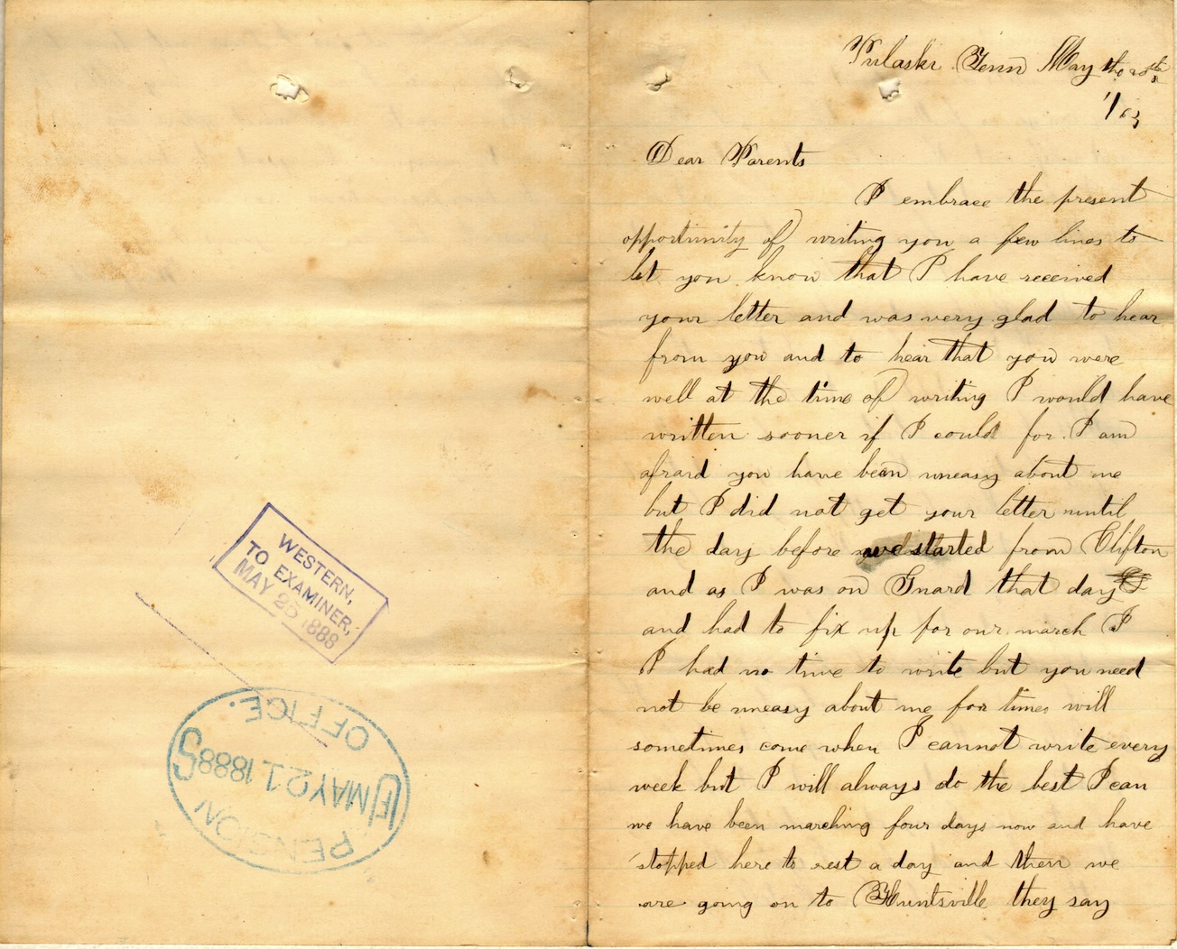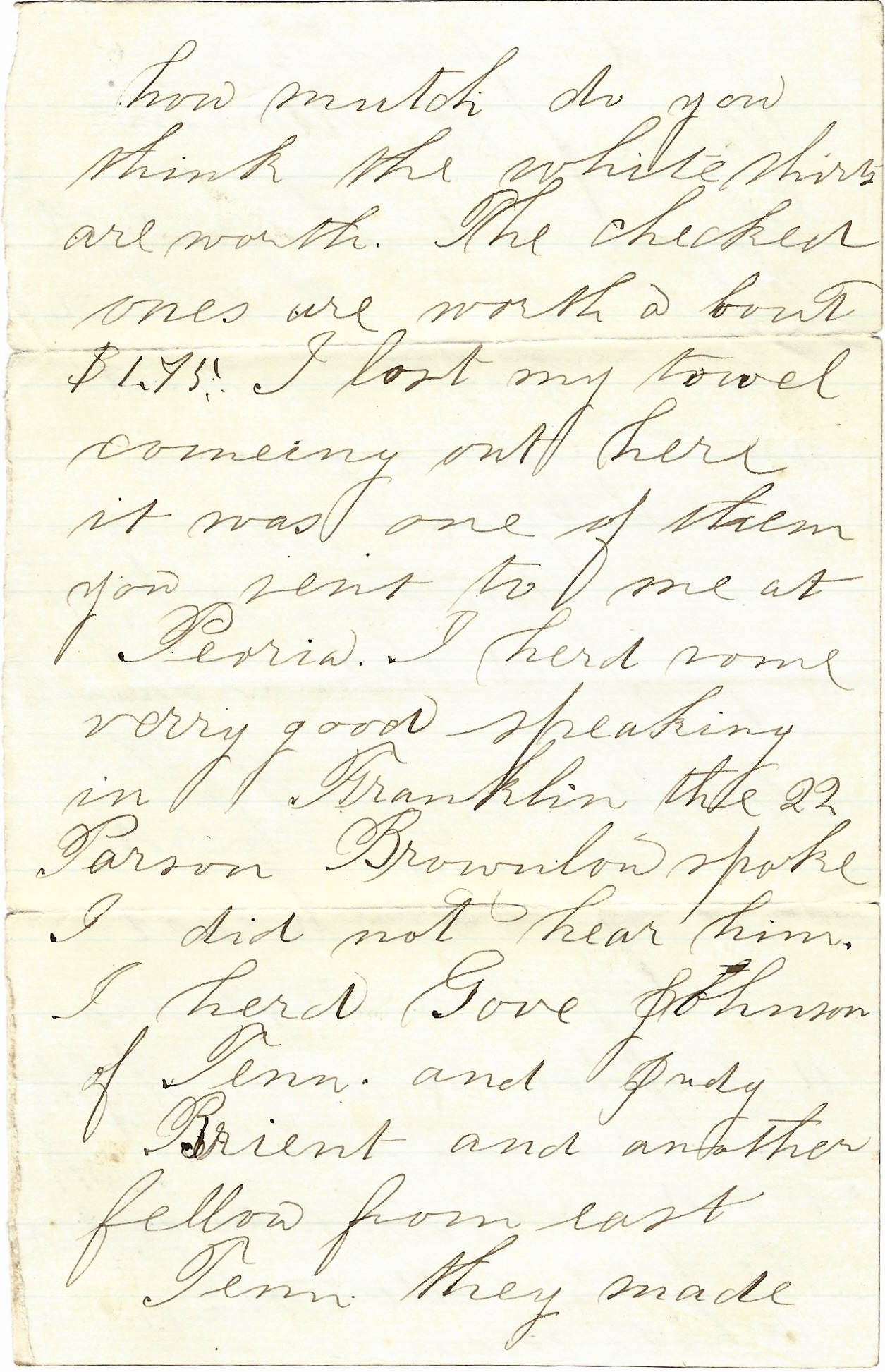 In answer to your kind favor of the 20th, I pen you a few lines tonight. I had begun to think that all my friends in Pike county except Rachel had forsaken me. But night before last, I was undeceived. The letters just poured in. I sat for about two hours and read letters and felt as clever as ever Aunt Sallie did in a Methodist lovefeast. You tried to excuse yourself by saying the reason you didn’t write was that there was nothing to write about. I accept no such excuses for there was something to write about. You were all alive and well, were you not? You could have wrote and told me that certainly. And I assure you, nothing could be written that would interest me so much as that. Just let me know that are all are well at home and I can get along very well. Of course I like to hear all of the news, but I want you to make this the last time that, like Macabre, you wait for something to turn up before you write. 1