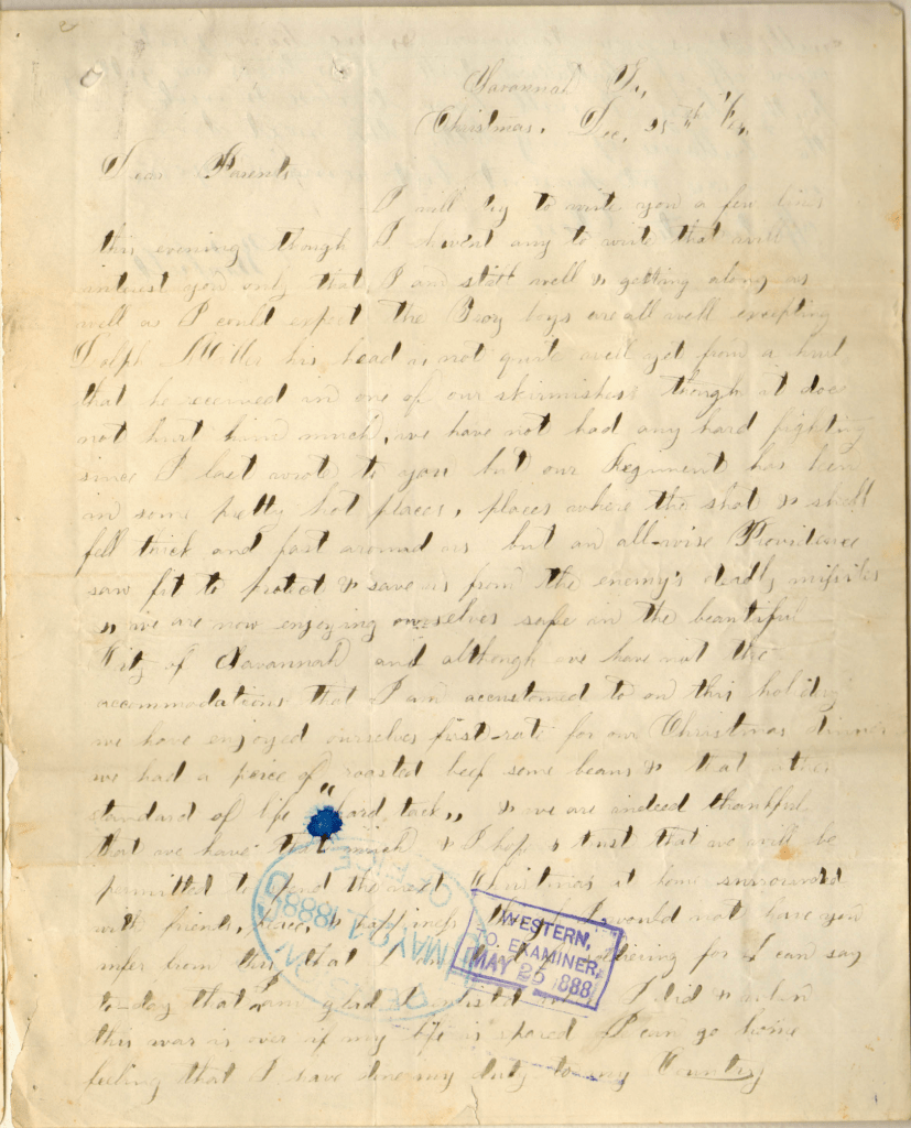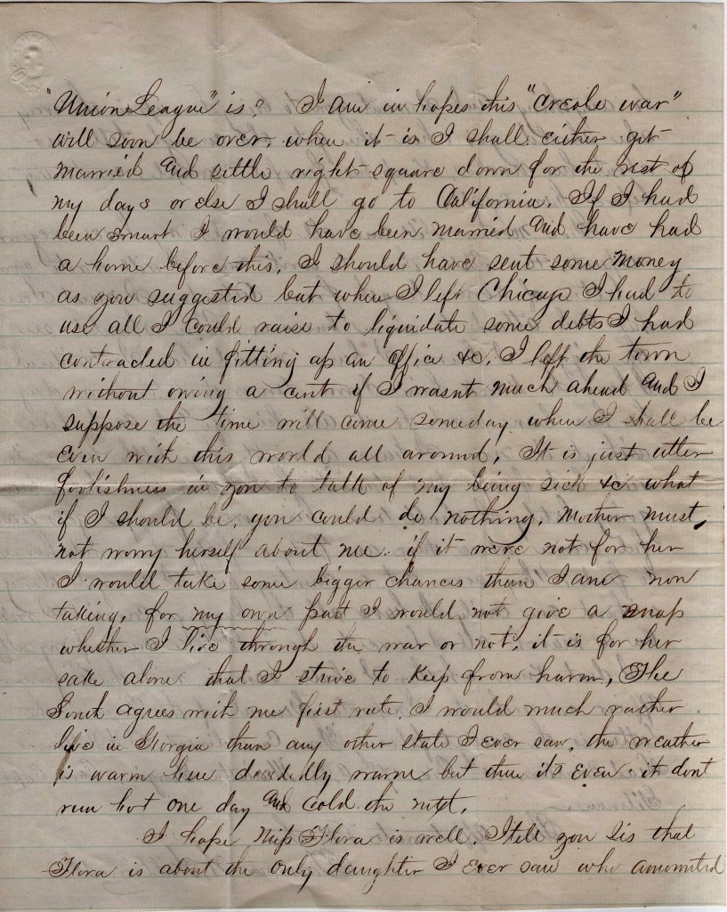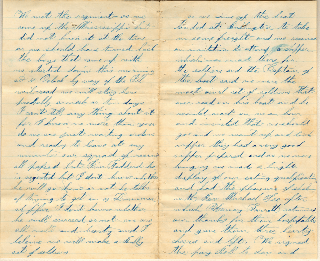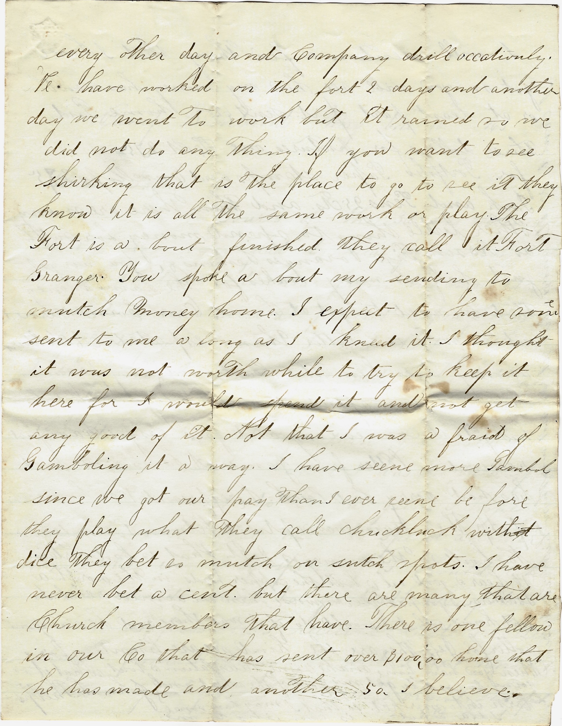 In answer to your kind favor of the 20th, I pen you a few lines tonight. I had begun to think that all my friends in Pike county except Rachel had forsaken me. But night before last, I was undeceived. The letters just poured in. I sat for about two hours and read letters and felt as clever as ever Aunt Sallie did in a Methodist lovefeast. You tried to excuse yourself by saying the reason you didn’t write was that there was nothing to write about. I accept no such excuses for there was something to write about. You were all alive and well, were you not? You could have wrote and told me that certainly. And I assure you, nothing could be written that would interest me so much as that. Just let me know that are all are well at home and I can get along very well. Of course I like to hear all of the news, but I want you to make this the last time that, like Macabre, you wait for something to turn up before you write. 1