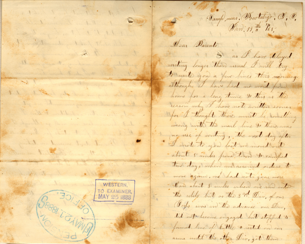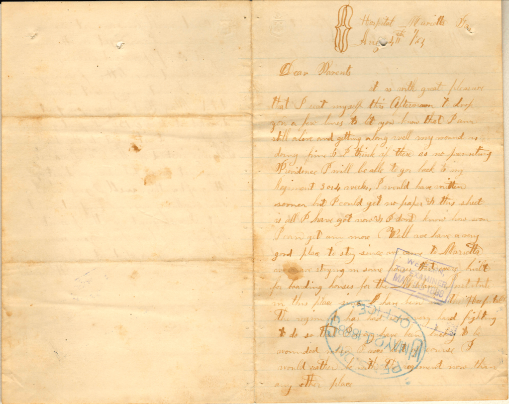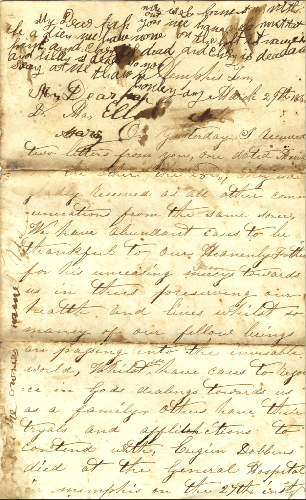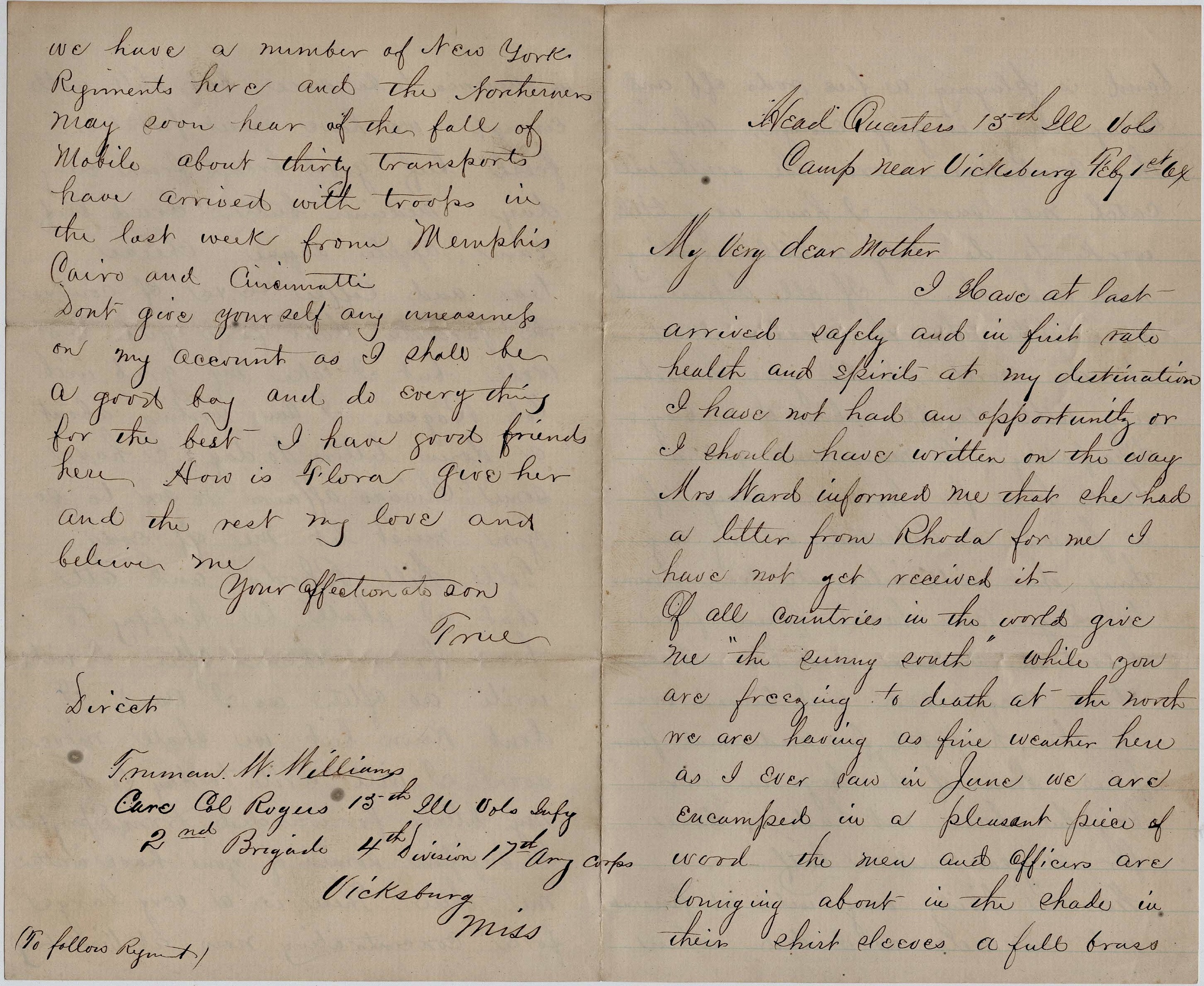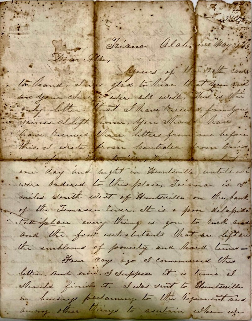 In answer to your kind favor of the 20th, I pen you a few lines tonight. I had begun to think that all my friends in Pike county except Rachel had forsaken me. But night before last, I was undeceived. The letters just poured in. I sat for about two hours and read letters and felt as clever as ever Aunt Sallie did in a Methodist lovefeast. You tried to excuse yourself by saying the reason you didn’t write was that there was nothing to write about. I accept no such excuses for there was something to write about. You were all alive and well, were you not? You could have wrote and told me that certainly. And I assure you, nothing could be written that would interest me so much as that. Just let me know that are all are well at home and I can get along very well. Of course I like to hear all of the news, but I want you to make this the last time that, like Macabre, you wait for something to turn up before you write. 1