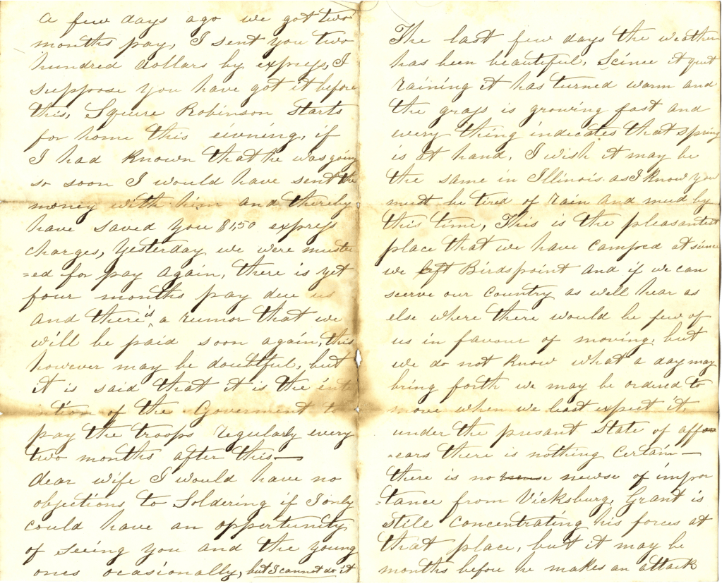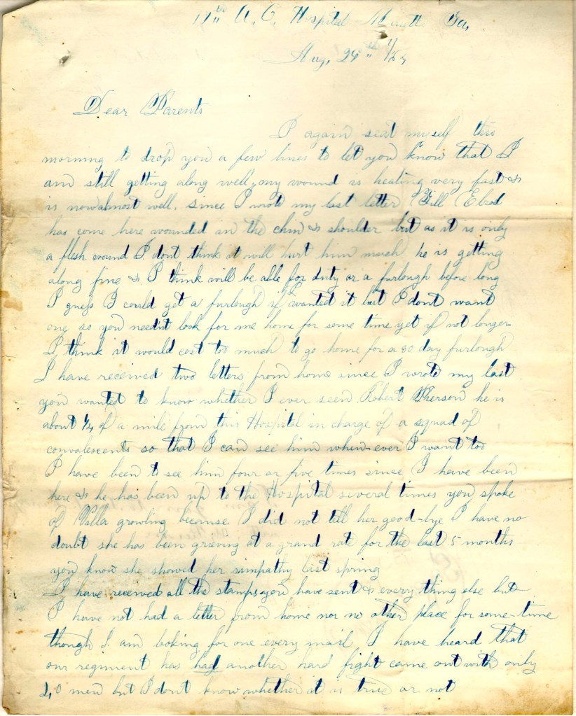 You advised me not to reenlist. I had come to that conclusion a while back not to do so, but I studied into the matter and felt satisfied in my own mind that another summer would end the war, and as the old enlistment would hold me until fall anyway, I changed my notion and concluded to go in. As Uncle Sam felt good enough to make me a present of four hundred adn two dollars and thirty days furlough, I thought it nothing more than right to accept both. When I get home, we will argue the point.