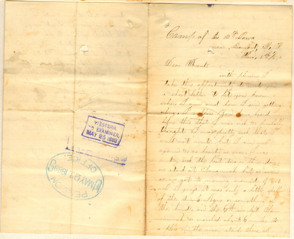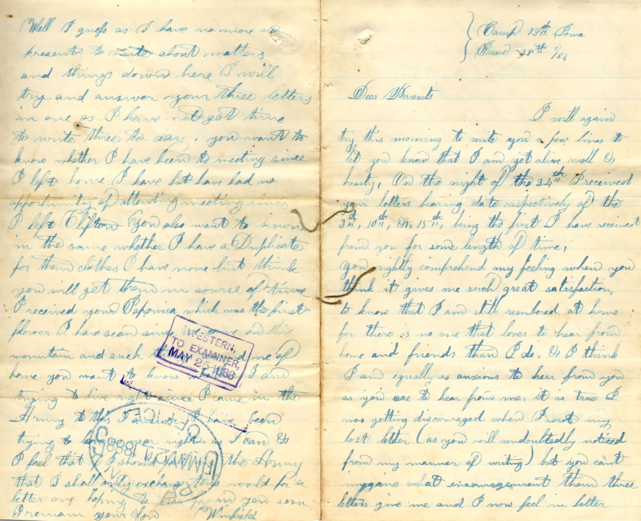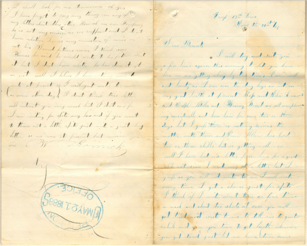We are now in camp but I am so busy making out my returns that I can’t write much so you must be satisfied with short letters for a while at least. I suppose from the tone of your letters that you are having gay times this winter with your turkey roasts and mighty societies and such. We are having gay times down here too but not just in your style. While speaking of parties, I wish to know what kind of party that your preacher and Iowa Kerns had. Who is Iowa Kerns? It seems your preacher is a gay chap, flogging the ladies in this day and age of the world. If he can’t contain himself but must fight, I would advise that a committee of old maids enquire into his case and if as deperate as his actions indicate, theyshould ship the fat gentleman down here and let him fight the Rebels. But if that should not suit him—which is very likely—he could have full swing at the wenches which I conceive would be much more Christian like than whaling the white women in Pike county—because he could not only preach to them but he could at te same time gratify his fighting propensities by thrashing them occasionally as they are used to it and would not mind it much.