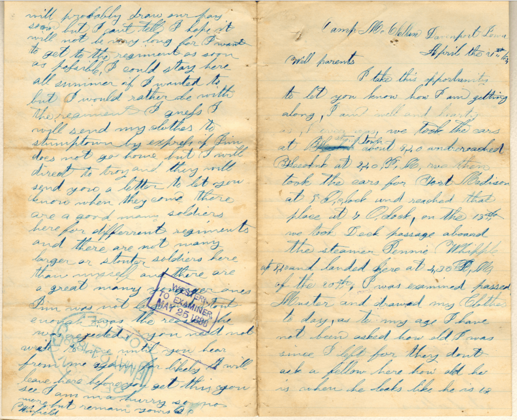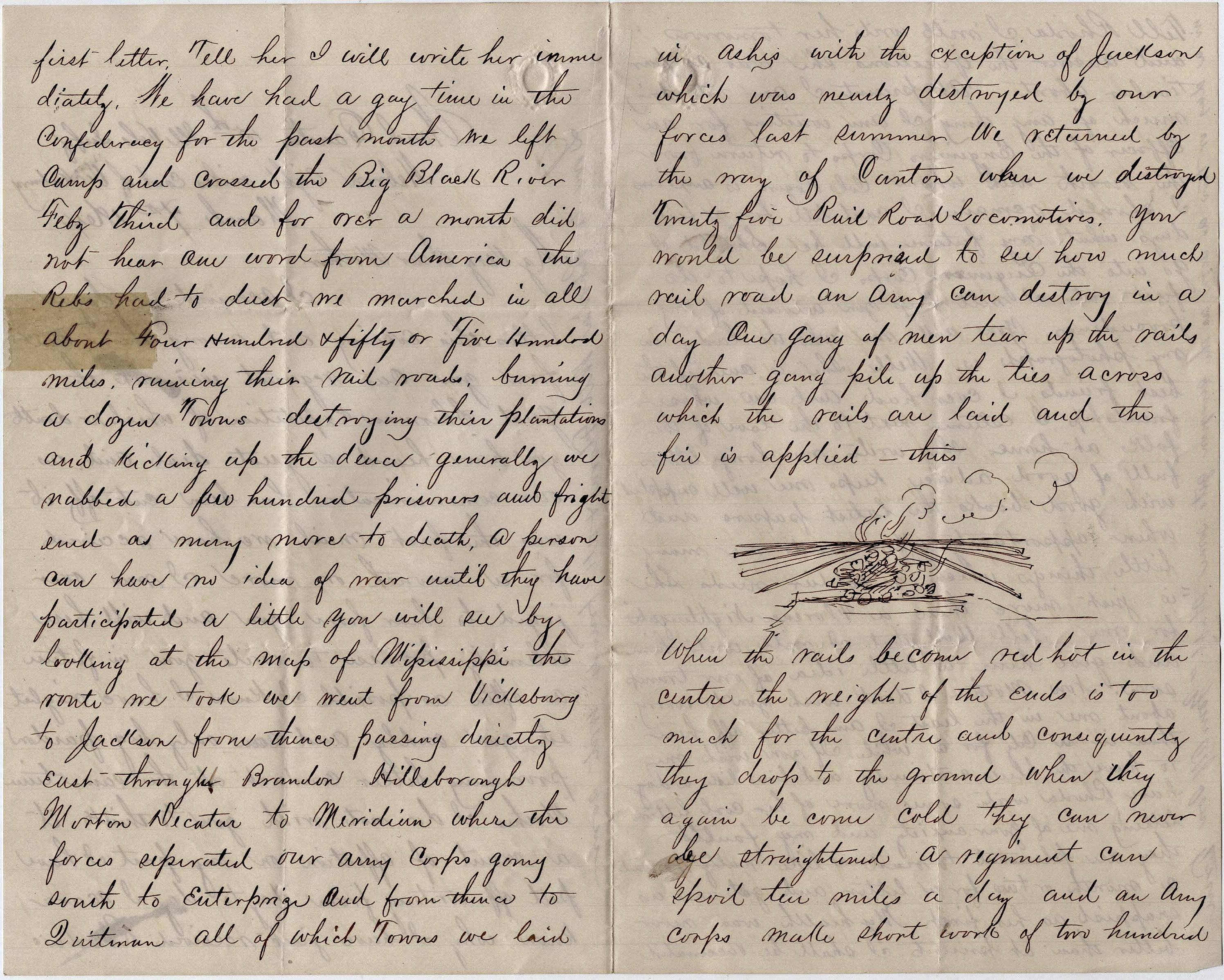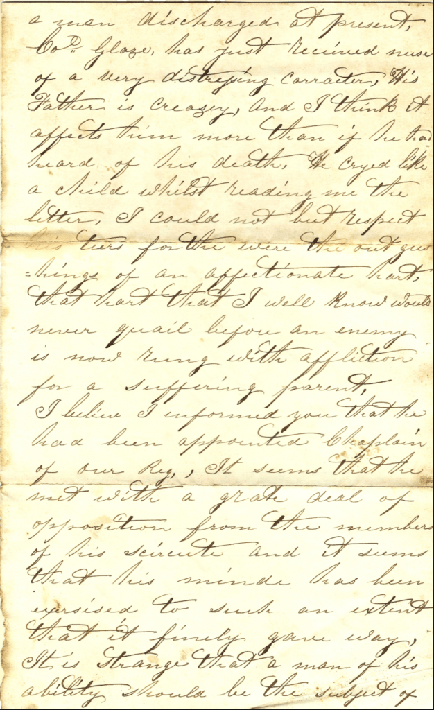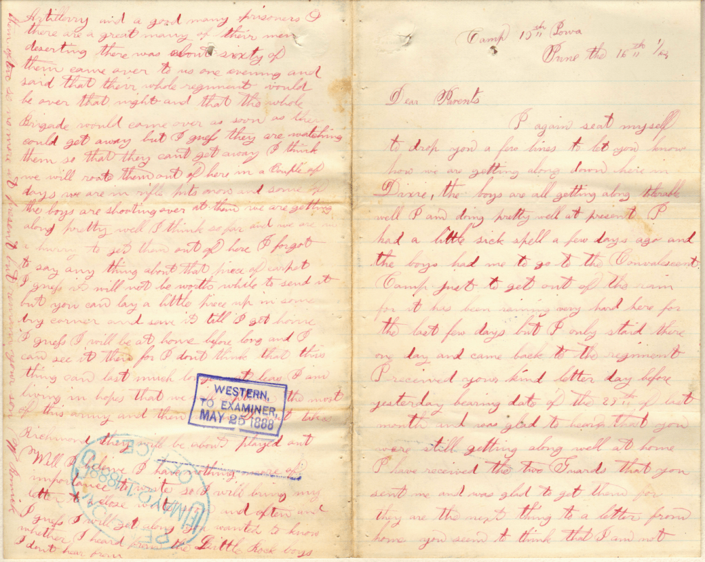 We are now in camp but I am so busy making out my returns that I can’t write much so you must be satisfied with short letters for a while at least. I suppose from the tone of your letters that you are having gay times this winter with your turkey roasts and mighty societies and such. We are having gay times down here too but not just in your style. While speaking of parties, I wish to know what kind of party that your preacher and Iowa Kerns had. Who is Iowa Kerns? It seems your preacher is a gay chap, flogging the ladies in this day and age of the world. If he can’t contain himself but must fight, I would advise that a committee of old maids enquire into his case and if as deperate as his actions indicate, theyshould ship the fat gentleman down here and let him fight the Rebels. But if that should not suit him—which is very likely—he could have full swing at the wenches which I conceive would be much more Christian like than whaling the white women in Pike county—because he could not only preach to them but he could at te same time gratify his fighting propensities by thrashing them occasionally as they are used to it and would not mind it much.