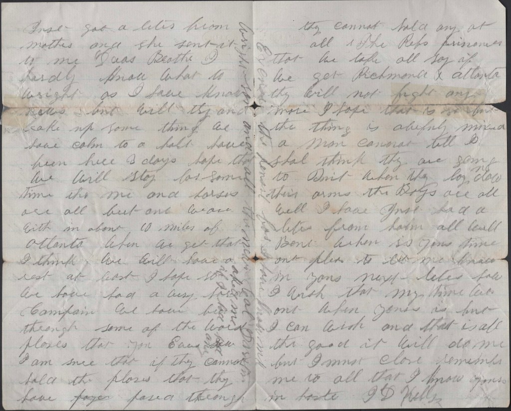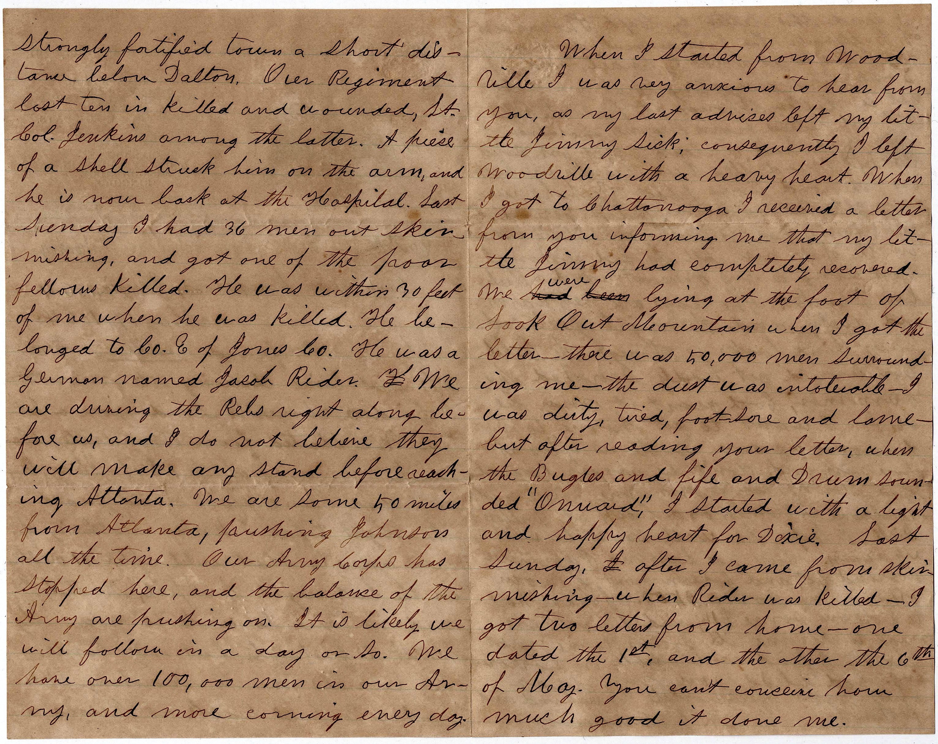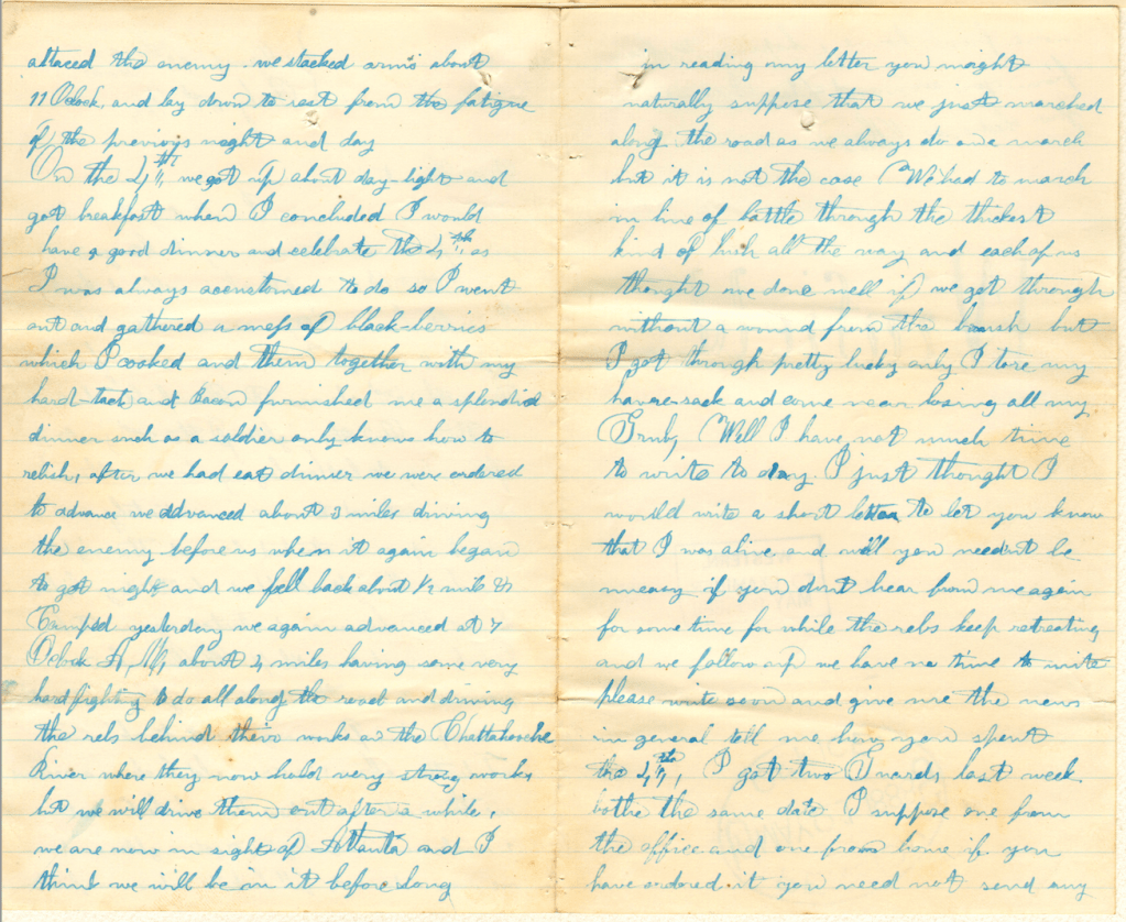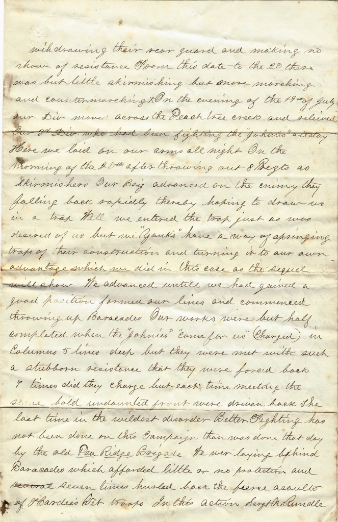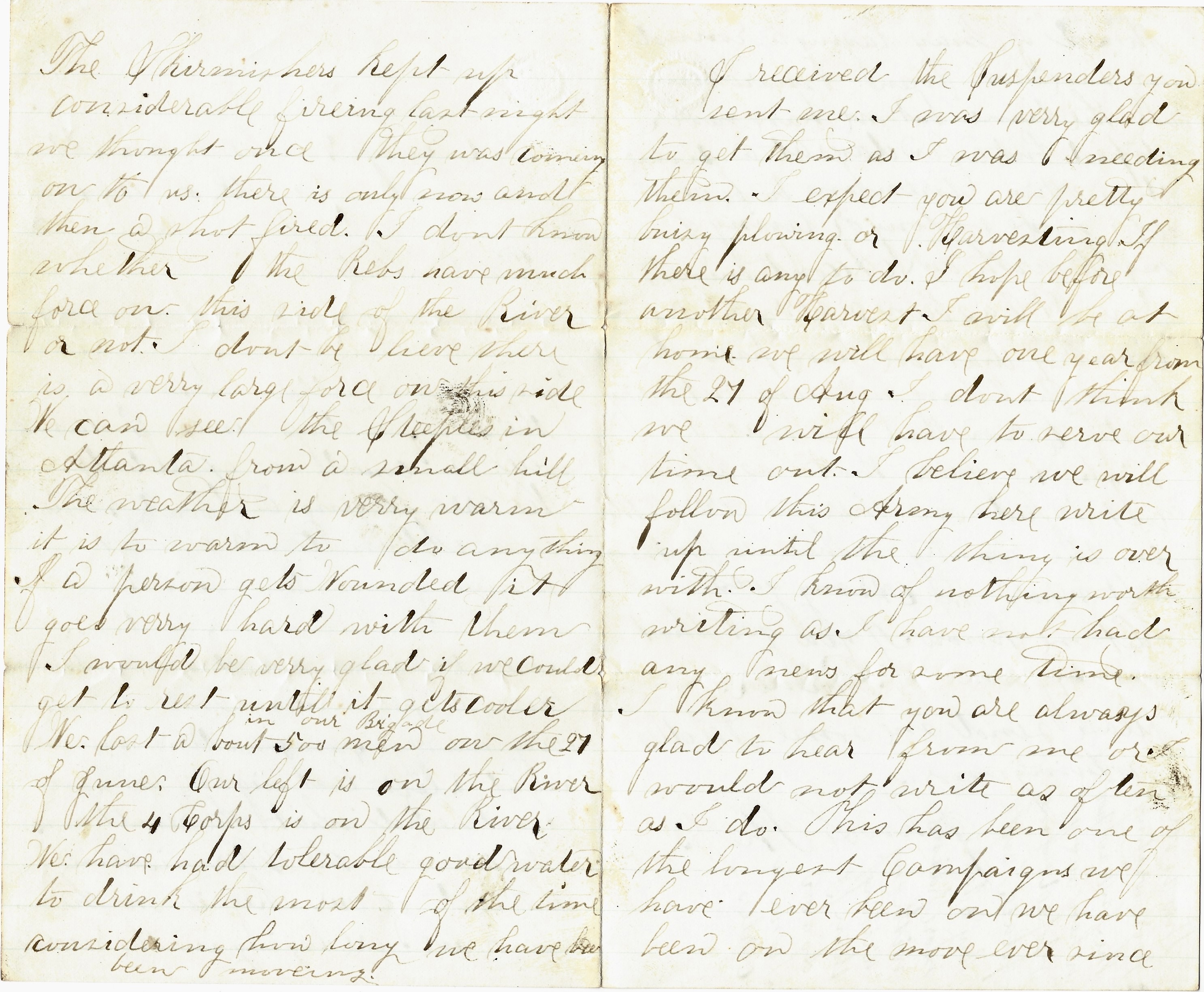 You can form some faint idea from this the difficulties this army has to encounter aside from Johnston’s army on the advance on Atlanta. Our progress thus far has been at times slow, but has been all the time onward until the present time. We have them drove across the Chattahoochee [river] and into the last ditch between the yank and the town. This river is about as wide as the Scioto [river] but deeper. Nearly all of our army except the 14th and 20th [Army] Corps and some cavalry are on the Atlanta side and are now beginning to crowd the Johnnies’ works pretty heavy. Day before yesterday, our Calvary attacked the Rebels cavalry on Cedar Mountain, seven miles east of Atlanta. The extreme right of their lines defeated and drove them off and still holds the mountain. This gives us a position that will eventually force the evacuation of the town or coop the Rebs up in their works which I do not think they will permit as long as there is a chance for them to get away.