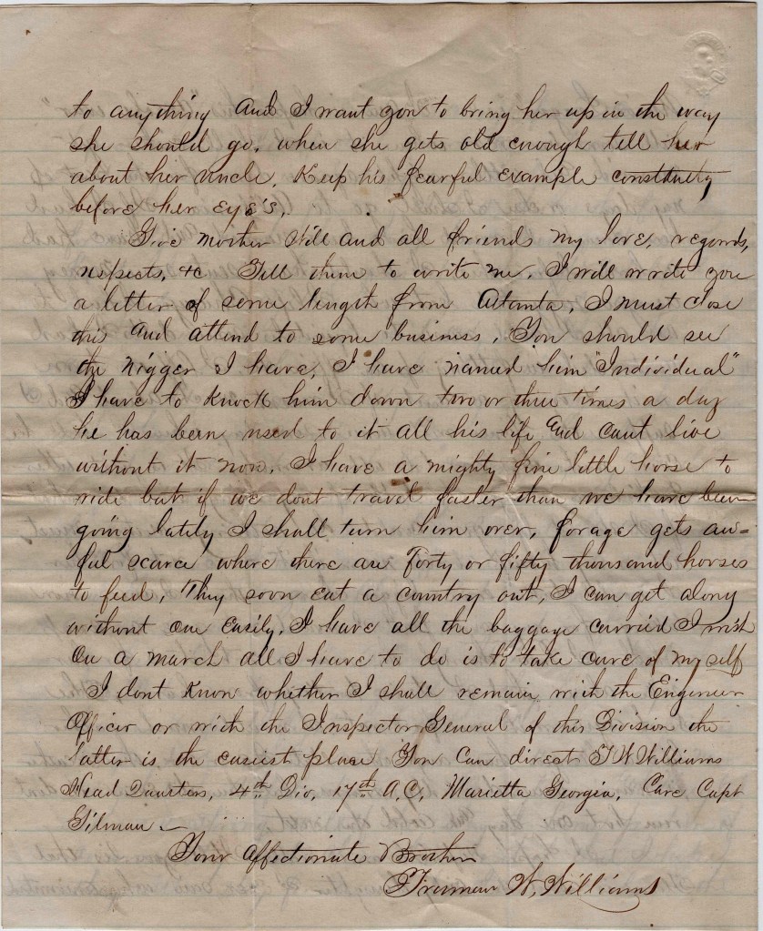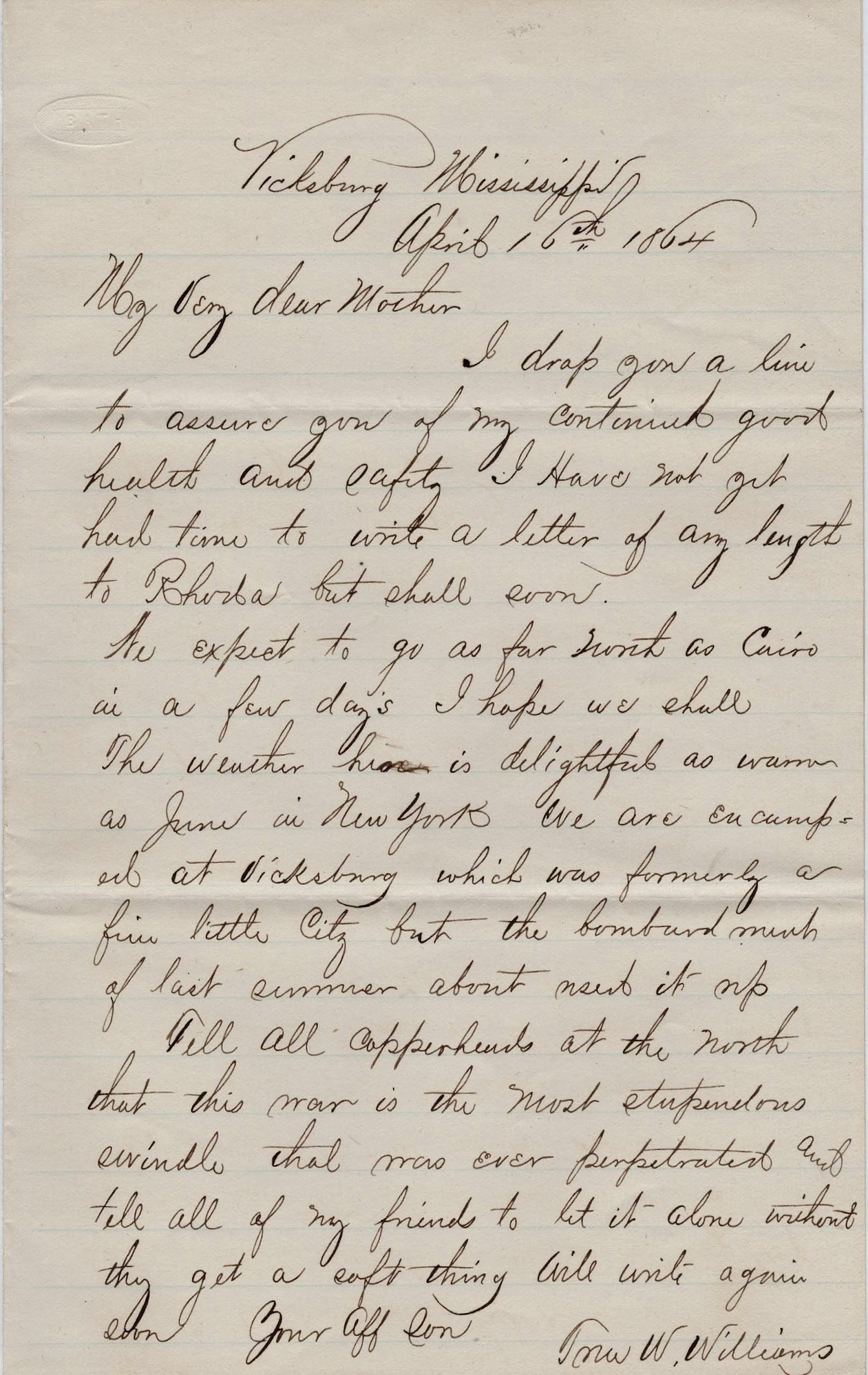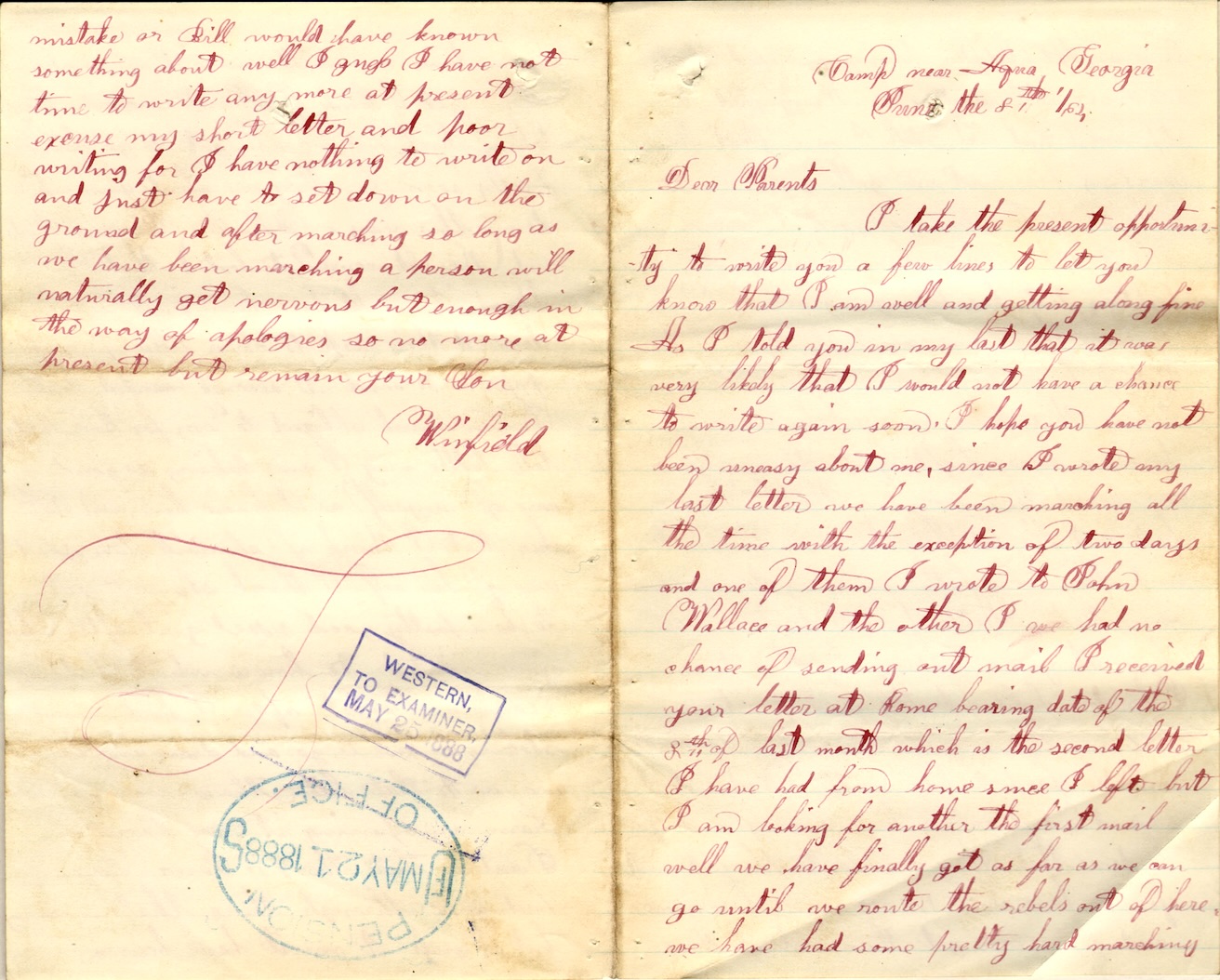 William possessed a noteworthy and engaging style of writing that stood out among soldiers. His expressions were often humorous and unusual. And of all the thousands of Civil War letters I have transcribed, his are the first to document the use of camouflage by Union skirmishers (see letter of June 9, 1864 before Atlanta).