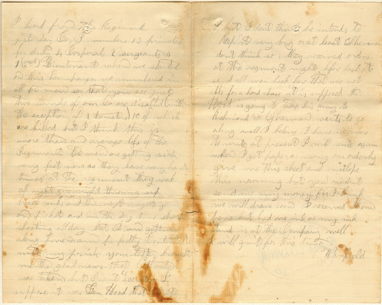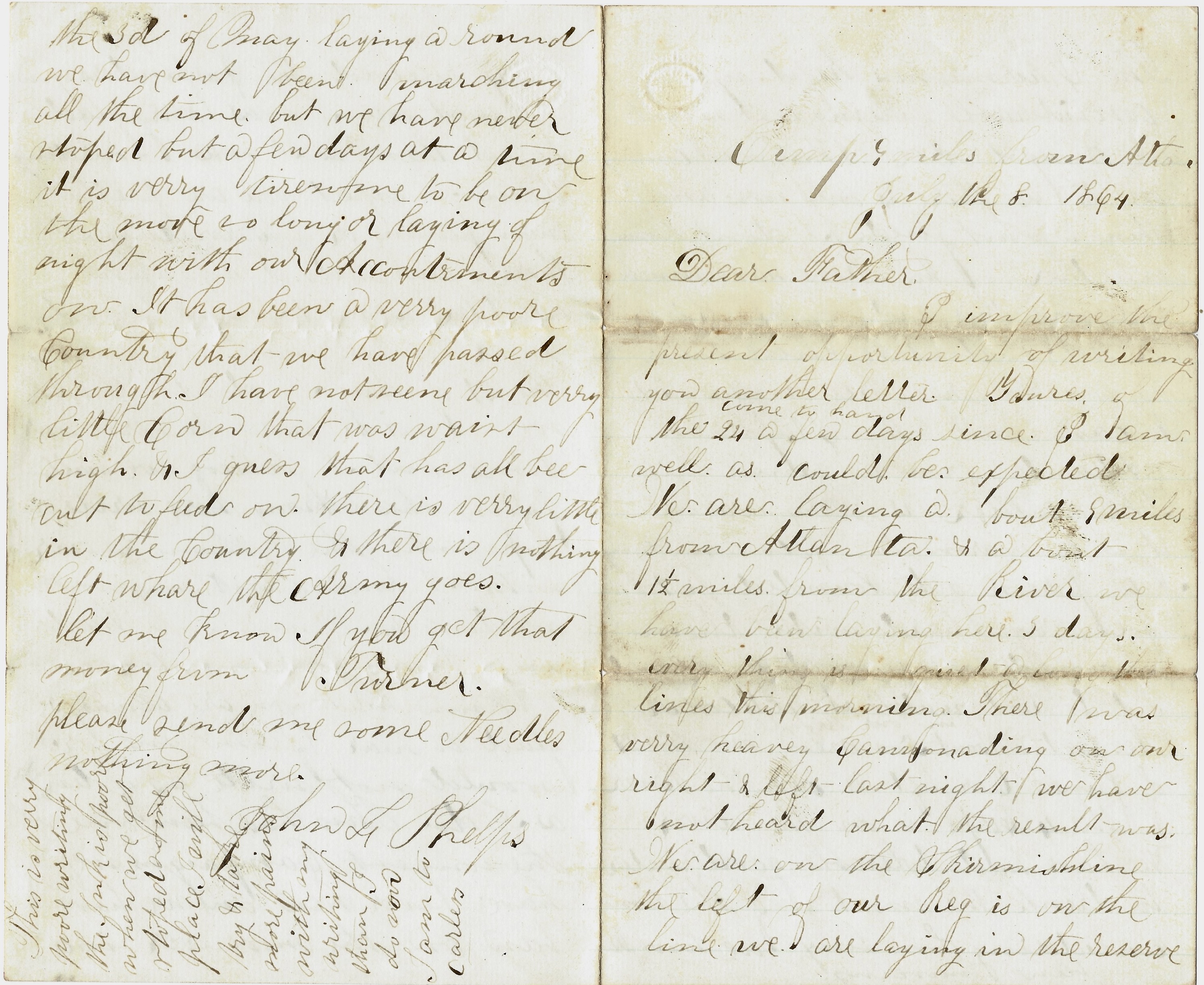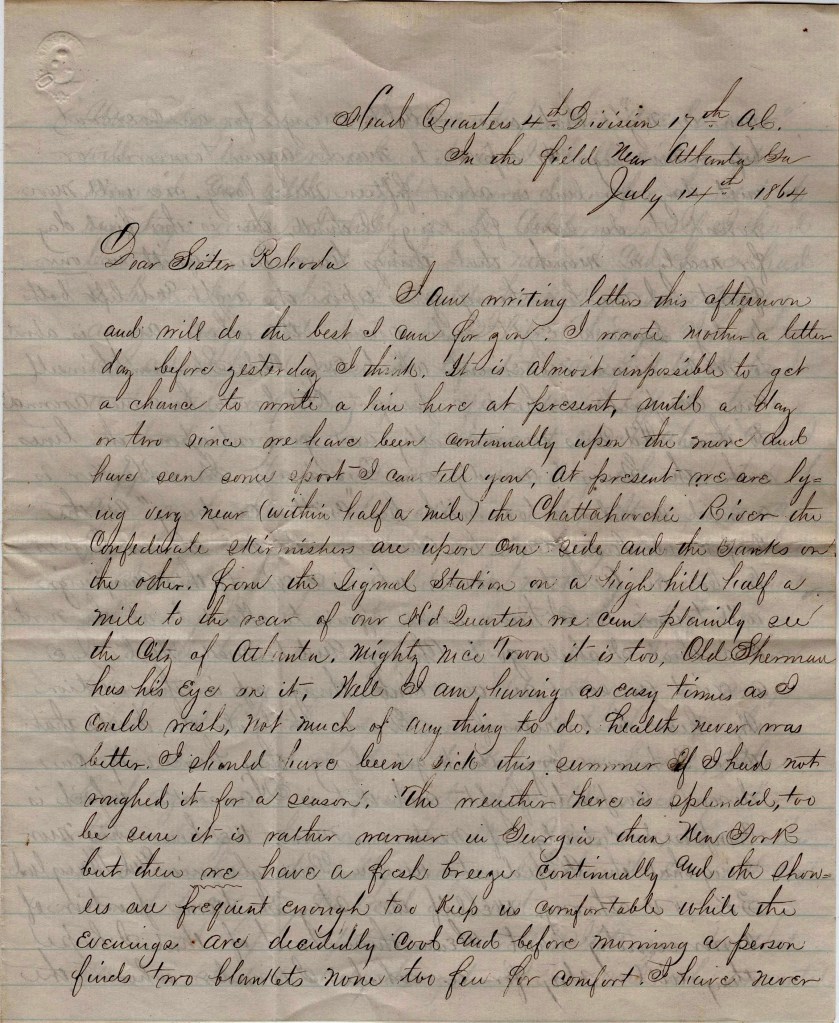 Our corps is still encamped on the heights a mile and a half from the river in full view of the steeples and a few houses in Atlanta which as the bird flies is 2 miles, but by the railroad, 8 miles. I think by the 15th of August we will be in town, and by the 1st of September, Grant will have Richmond. This is my private opinion, publicly expressed. From accounts, the Johnnies are stirring them up tolerably lively in Maryland. It will not amount to much in my opinion. It is a raid to obtain supplies more than with the expectation of diverting Grant from his great purpose of capturing the Rebel Capitol. The prospects of the Rebels are now desperate and they know that unless they can gain some important advantage, and that soon, they are ruined forever. They are satisfied and so am I that this is the last year of the war and if they cannot defeat our armies this summer and fall, they never can do it. Hence their reckless dashes and efforts to destroy the yanks. I am satisfied the result will be alright and six months from this time will see the end.
