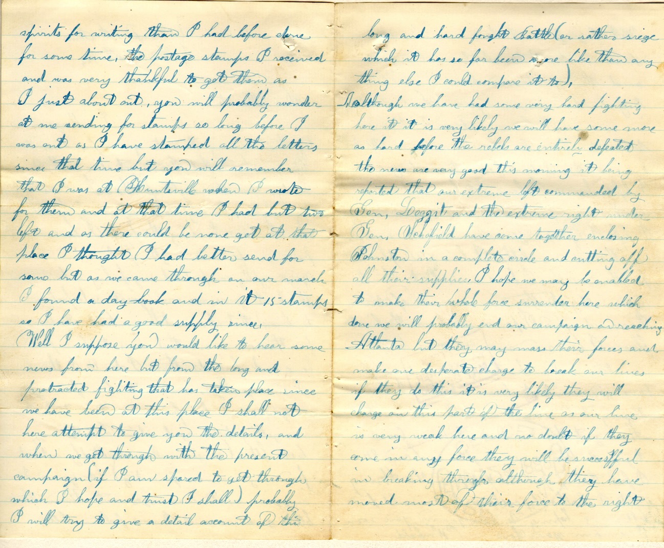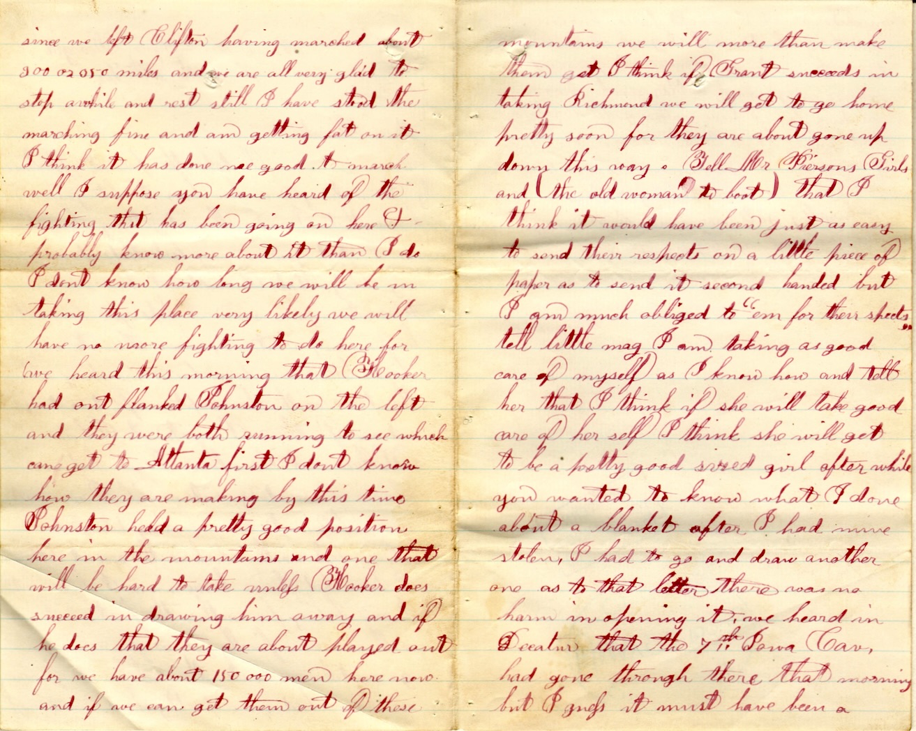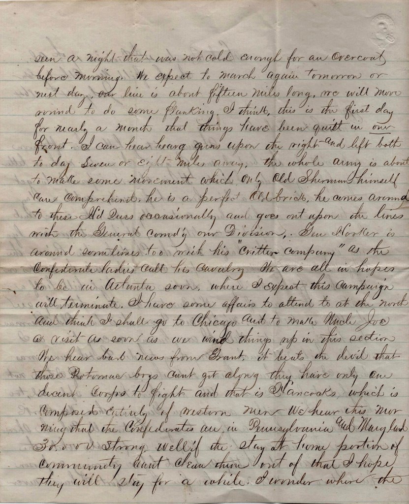 The skirmishers before they start in, breaks a lot of twigs with the leaves on and sticks them all over the front of their persons, being very careful to stick a large bunch in the hat band in front. The idea is to look as much like a bush as possible to fool the Johnnies, each being fixed up in green. They start in walking as though on eggs [but] in a very short time the guns begin to crack and bullets whistle. The Johnnies hang to their thickets to the last moment. But the Yankees, like Old Virginia, never tires and they have to get out of it at last, fast as their legs can carry them. People at home may think that the good work goes on very slow in this direction, if any such there be. They know nothing about what the difficulties are. When you read this, you will have some idea of them. But thank Heaven, we are gaining ground and the further we advance south, the more open the country becomes. And as these difficulties lessen, the more telling will be our blows on the Rebel armies and I think by the time we reach Atlanta and Montgomery, those armies will be about used up and dispersed. And then the end approaches, for just as soon as this and Lee’s army, or either of them, is dispersed, the Confederacy is gone beyond the hope of recovery by Davis, the Devil, or any other man. Mark that, and I am satisfied that four months is ample time in which to accomplish the good work. And if the hard fighting is not over within that time, I miss my guess—that’s all.