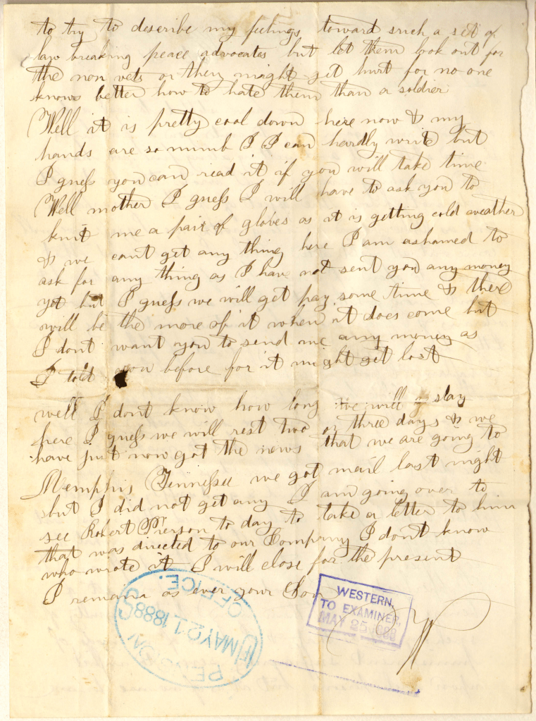 My health is only tolerable good. A spell of the headache has been bothering me for the last several days, but is better tonight. And to make htings more disagreeable, I have had muster rolls to make out, the monthly return of the company, and a great deal of other writing besides, so that I am about played out in that line. So you will have to excuse all deficiencies in this letter—both of manner and matter.