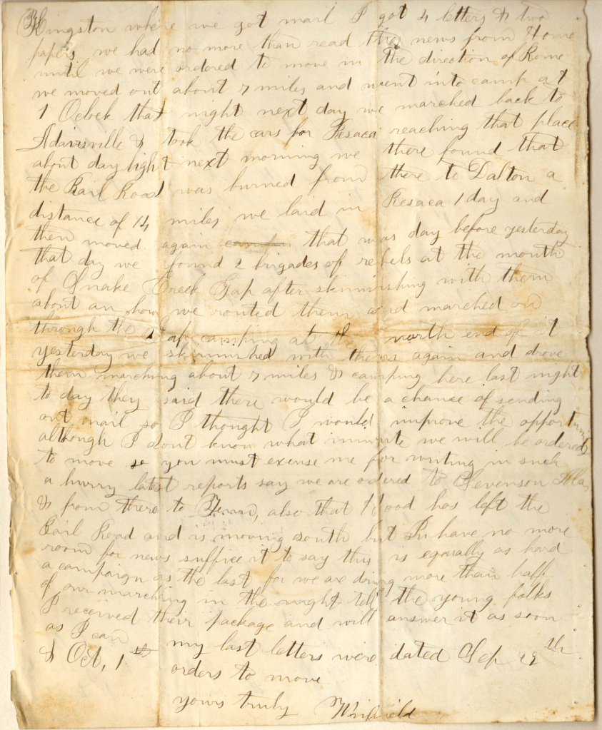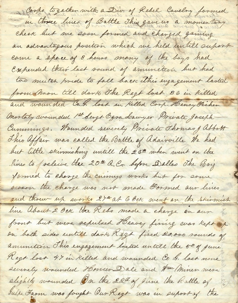 Joking aside, if the heat at home has been anything like as great as it has here, I pity you and you have the heartfelt thanks of the soldiers for the sympathy you express for us, for this is truly an awful place. This is hardly any cleared land in this whole region of country. It is one everlasting jungle of black jack scrub pines, green briars, thorns and all other kinds of bushes that ever was thought of, and a great many that never was thought of, I believe, all growing in one eternal jumble, and so thick almost everywhere that a bird can’t fly through. Add to all this the face of the earth which contains nary level foot so far as I have yet been in the delectable state of Georgia. But it’s broken up into holes, knolls, three cornered ridges, little knobs, ravines, and gullies—the sides so steep while chasing the Johnnies the first thing we know, sometimes we are at the bottom of them and have to look straight up to see out. It seems as though long ago some internal convulsion of the earth tossed this country from someplace down below, and it don’t seem to have to got used to the change yet. But everything seems out of place and out of shape. Even the stones don’t seem to have yet become accustomed [to] the situation for in the place of occupying a horizontal position like rocks in a civilized country, they stand on end on the corners, the edges, and every imaginable way.