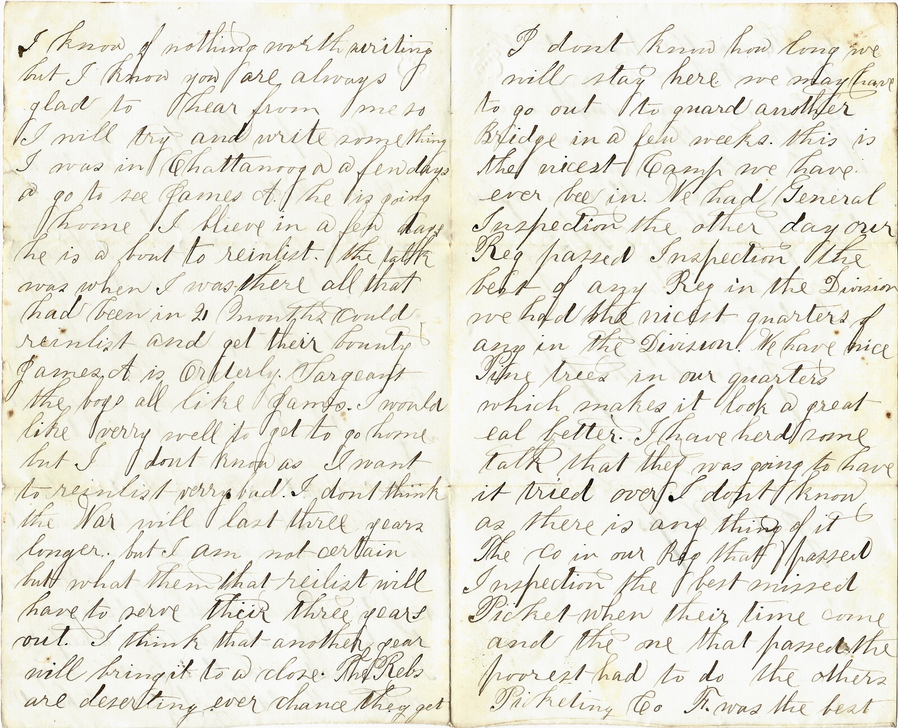 There is nothing of interest to speak of going on in this region just now except the reenlisted regiments getting ready to go home [on Veteran’s furlough of 30 days]. The 33rd [Ohio] I suppose will get off one day this week.