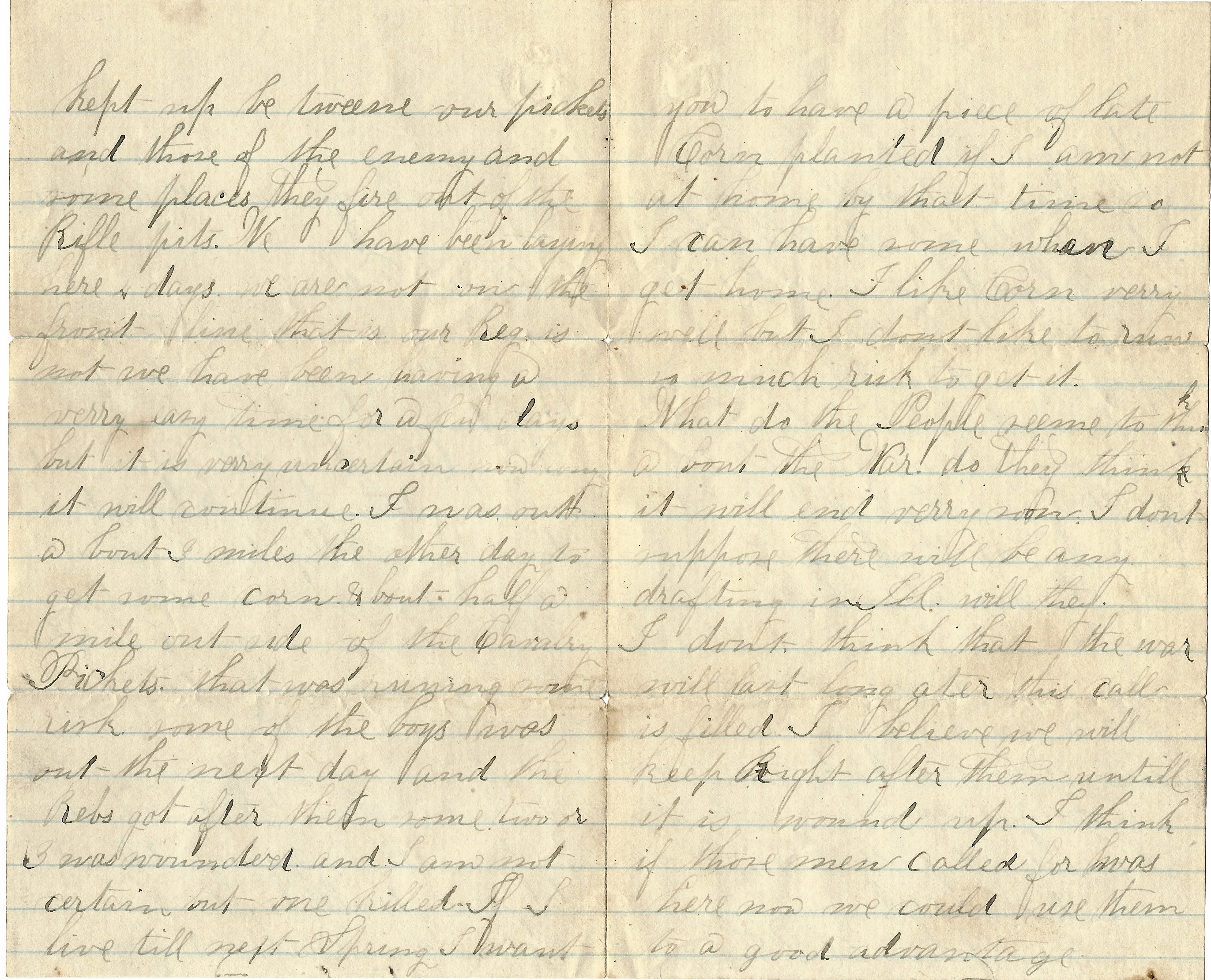 I am much pleased to hear that the weather god has at last concluded to do like the ladies always does on Crooked Creek—follow the fashions a short space and has given you plenty of rain. I am sorry that the prospect for corn on the old place is so poor. But as plenty of rain has now come, if the fall is favorable as common, no danger but what corn sufficient will be raised to make all the meat that may be required and as bread more than sufficient for another year is already secured. The dwellers around the old point have every reason to congratulate themselves and as the prospect is favorable yet for plenty of turnips and although potatoes may be few in a hill and small at that, yet there may be some cabbage, some plump hens, some parsnips, some beans, some blackberries, some apples, some dried roasting ears [and] all these together—although little of each—will make a pretty large sum. I want you and Rachel to see to it that you help father take care of all and each of these things. If you do, although thousands throughout the country during the dark and stormy days of the coming winter, will suffer the gnawings of hunger, yet our own little ones can revel in abundance. As long as there is anything on the old place to eat, it is my desire that yourself and little ones shall have part of it.