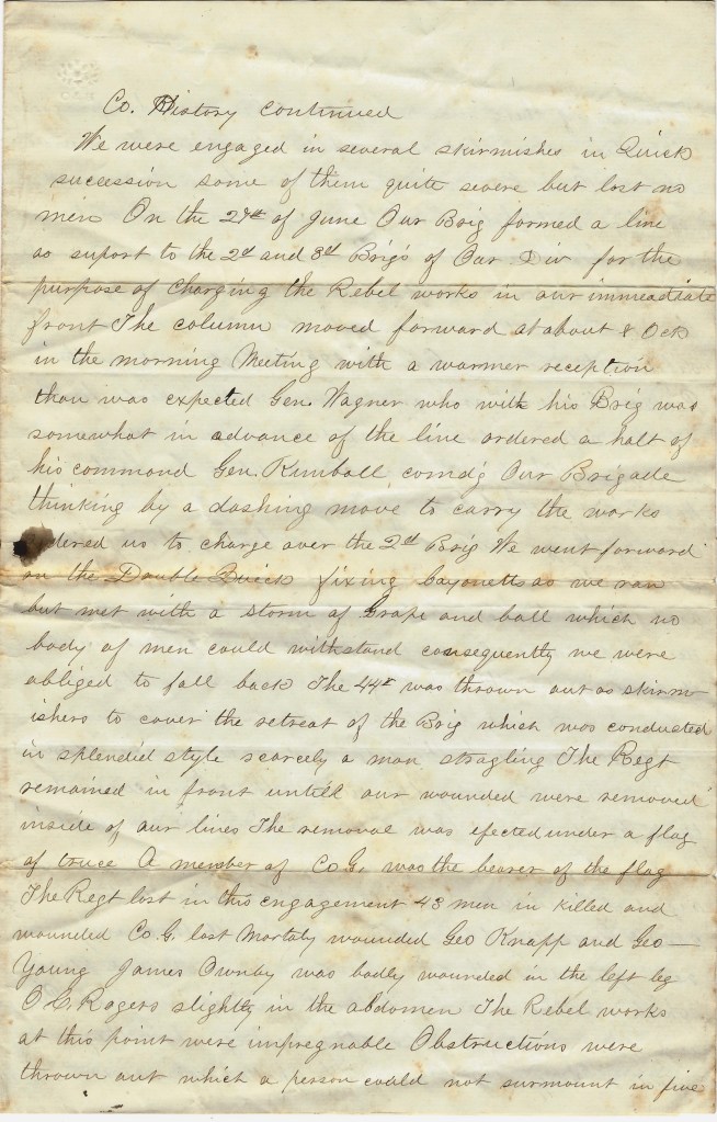 You can form some idea of the battlefields of Resaca and this place when I tell you that the thicket in the fallen timber above Moot’s town is not as dense as it is where the two last fights took place although the hills there are a little higher. I leave you to guess what a nice time our fellows had hunting the Johnnies in such a place, who like a pack of wolves were hid behind every tree, log, or stone, and the brush so thick that you could not see a man until nearly on top of him. And wherever the ground was favorable, they had breastworks of logs and earthworks thrown up, and in making our approaches our men several times unwittingly run against them and suffered heavy loss in consequence. This is the way the 23rd [Army Corps] was cut up so badly. The officer in charge of the Brigade, like a fool, run them into it and he might just as well have run them into Hell five at once.