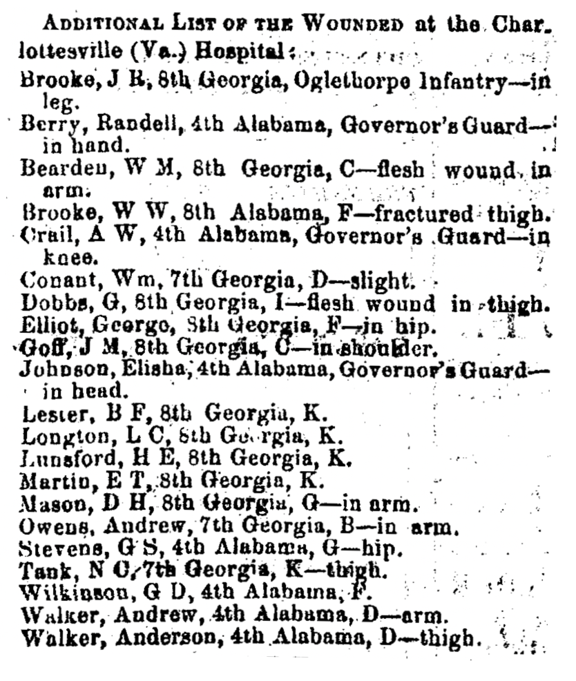 The following brief diary was kept by 25 year-old Gilbert D. Wilkinson (1836-Aft1910) who enlisted in Co. F, 4th Alabama Infantry on 26 April 1861 at Huntsville, Alabama. Gilbert’s name was recorded as “George” in the company records and may be found under both names but I’ve used Gilbert since this appears to have been his birth name. Gilbert was with his regiment in the early days of the war until he was “severely wounded through both thighs” at the First Battle of Manassas on 21 July 1861. He was taken to a hospital at Charlottesville for treatment but, being permanently disabled, was never able to return to his regiment and served until November 1864 as a hospital steward while he pursued “studies at the University.” He was officially discharged on 11 July 1865.