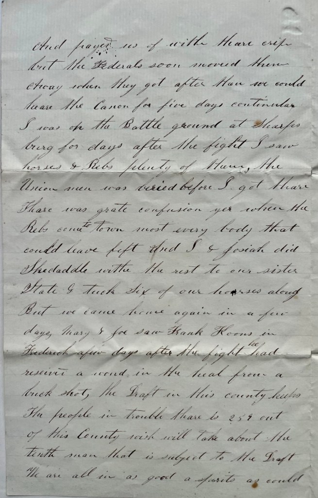 We could hear the cannon for five days continually. I was on the battle ground at Sharpsburg four days after the fight. I saw horses and rebs—plenty of them. The Union men was buried before I got there. There was great confusion here when the rebs came to town and I and Josiah did skedaddle with the rest to our sister state and took six of our horses along. But we came home again in a few days. Mary & Joe saw Frank Koons 1 in Frederick a few days after the fight. He had received a wound in the heel from a buck shot.