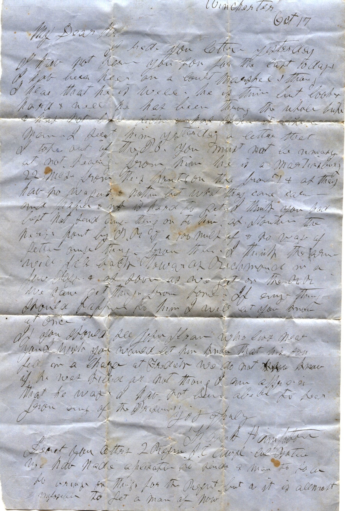 I write this morning to let you know that I am still able to be around. For the last eight days if I had been at home, I should not have been able to be up at all but I felt better yesterday. I am so weak that I cannot walk half a mile. The morning of the fight I was terrible sick. I could keep nothing on my stomach a minute. We did not expect a fight that day. We had marched all night and got the order to make ourselves comfortable for the day. I had to ride in the ambulance. That night I was so sick I could not sit up. We had just got laid to rest for the day as we supposed when came the order bring up the troops. We were seven miles from Cedar Creek. The Rebels had driven in our pickets.