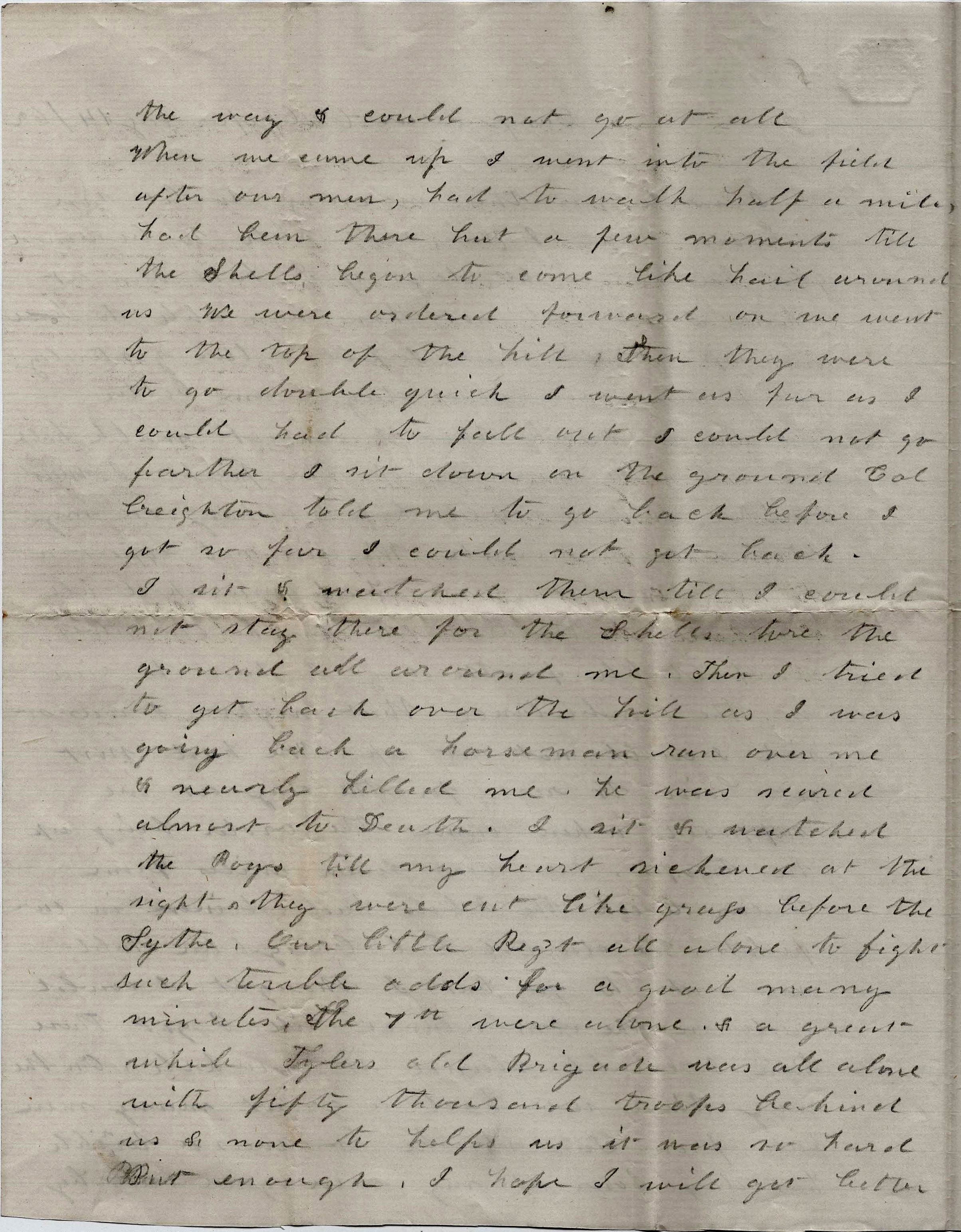 [When] we started, Col. [William R.] Creighton told me not to go but I thought I could ride in the ambulance till I got there, then I could stand it awhile. On the way there we had a great many men fall from sun stroke. It was a terrible hot day. Four of my men gave out by the way & could not go at all. When we came up, I went into the field after our men, had to walk half a mile. Had there but a few moments till the shells begin to come like hail around us. We were ordered forward. On we went to the top of the hill. Then they were to go double quick. I went as far as I could [but] had to fall out. I could not go farther. I sit down on the ground. Col. Creighton told me to go back before I got so far I could not get back. I sit and watched them till i could not stay there for the shells tore the ground all around me. Then I tried to get back over the hill. As I was going back, a horseman ran over me & nearly killed me. He was scared almost to death. I sit & watched the Boys till my heart sickened at the sight. They were cut like grass before the scythe. Our little regiment all alone to fight such terrible odds. For a good many minutes, the 7th [OVI] were alone & a great while Tyler’s old regiment was all alone with fifty thousand troops behind us and none to help us. It was so hard.