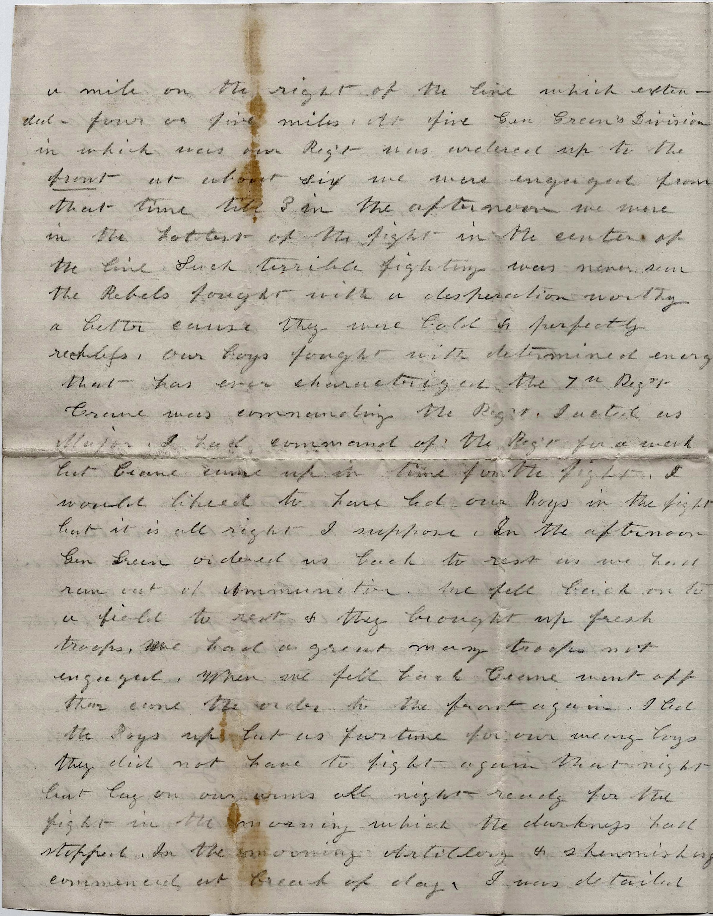 On Wednesday the 17th we came up with them after marching all night, sire and tired. At four they opened on us and drove our men back half a mile on the right of the line which extended four or five miles. At five Gen. [George S.] Greene’s Division in which was our regiment, was ordered up to the front. At about six, we were engaged from that time till 3 in the afternoon. We were in the hottest of the fight in the center of the line. Such terrible fighting was never seen. The Rebels fought with a desperation worthy a better cause. They were bold and perfectly reckless. Our boys fought with determined energy that has ever characterized the 7th [Ohio] Regiment. [Maj. Orrin J.] Crane was commanding the regiment. I acted as Major. I had command of the regiment for a week but Crane came up in time for the fight. I would liked to have had our boys in the fight but it is all right, I suppose.