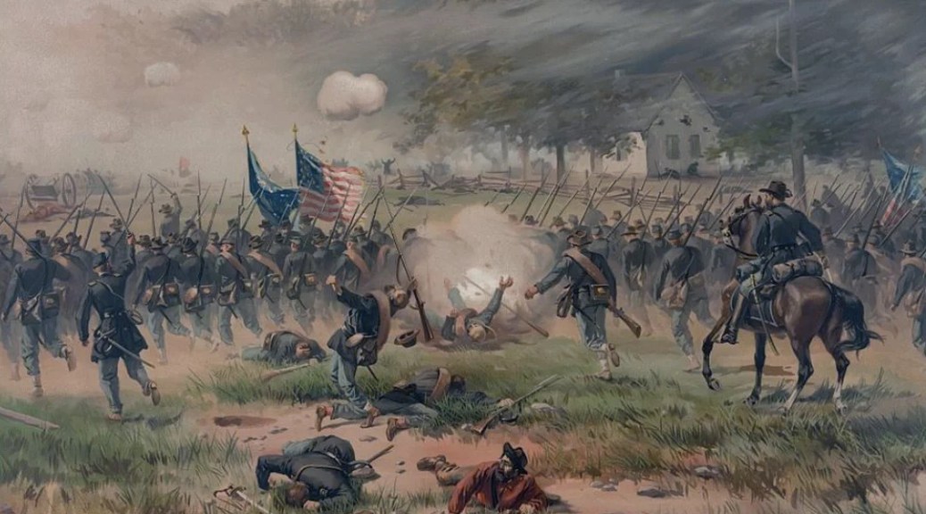Our troops were repulsed with a large loss in killed and wounded and they fell back to their old place in line. Towards evening the opened a cross fire on us from a battery near the town. Their 1st shot smashed a wheel on a gun limber, took off a sergeant’s leg, and a private’s arm. Some horses killed and wounded. On the 14th and 15th lay in position with few shots from either side, both watching for a move from the other.