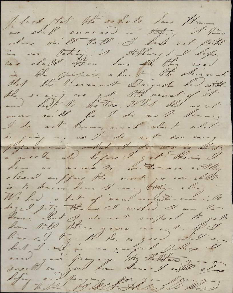 I must bring my letter to a close. My pencil is so bad I can hardly write with it. I would be very glad to hear from you all once more if I could. I haven’t heard from you since the 7th of August. I would sooner see you all than to hear from you. I think we will get furloughs this winter if nothing happens. I hope the war will soon come to a close and we will be permitted to go home once more. I don’t think the war can last long the way it is going now.