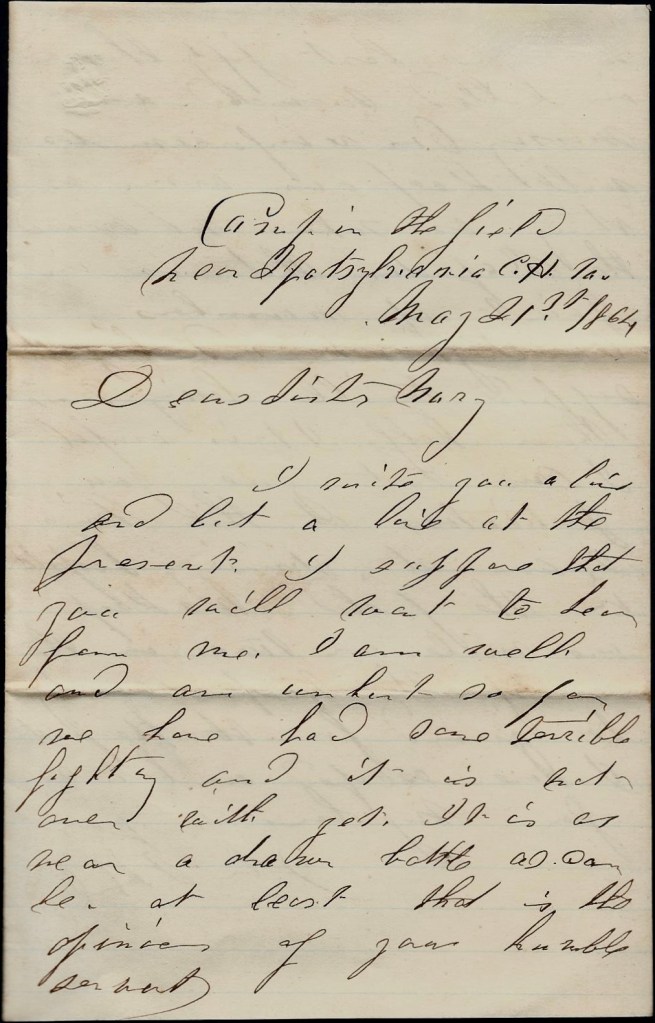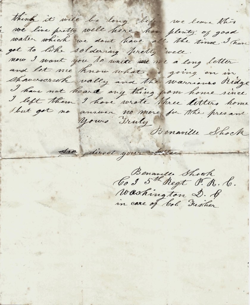 Now I want you to write me a long letter and let me know what is going on in Shavers Creek Valley and the Warrior’s RIdge. I have not heard anything from home since I left them. I have wrote three letters home but got no answer. No more for the present.