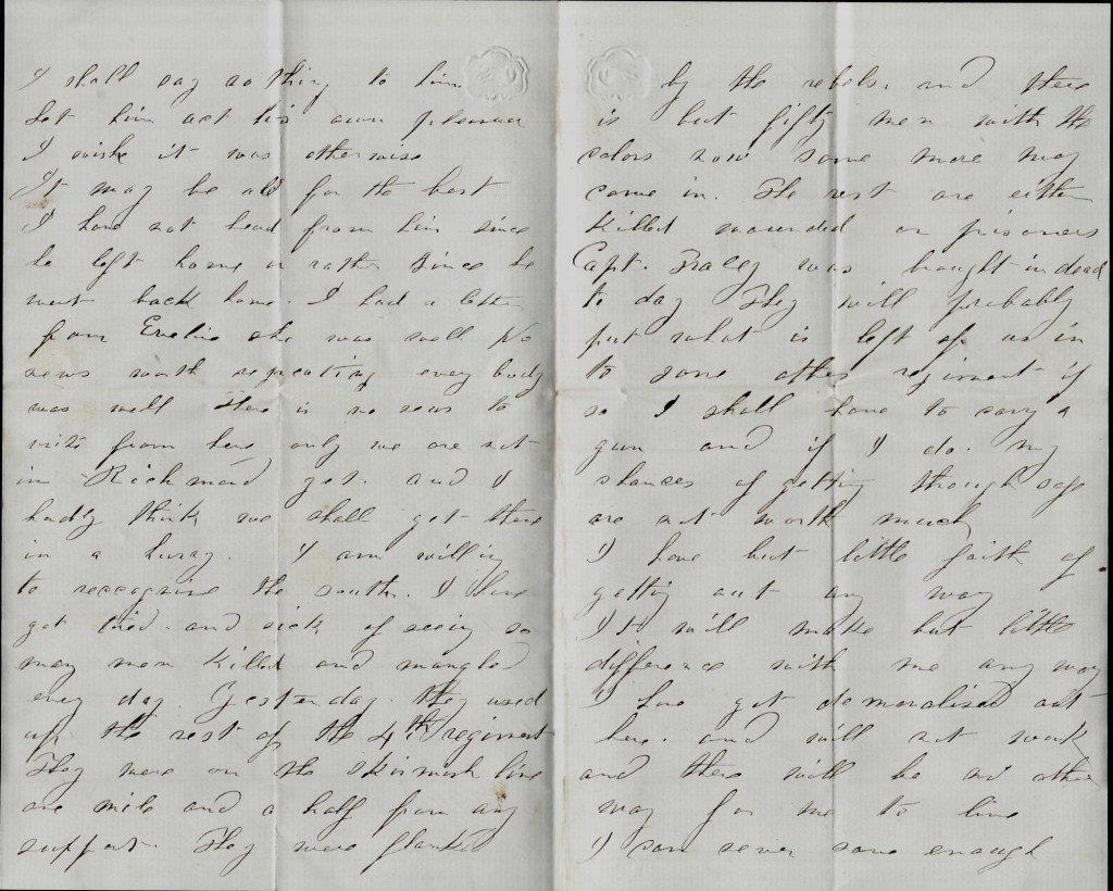When I see you which I hope to some day if I don’t be unfortunate like many other comrades who fell on some of the many battlefields which our regiment has been engaged in, I will then talk to you and tell you how I have suffered. Yet I am willing to suffer more in a just cause—to have the Union as it was.