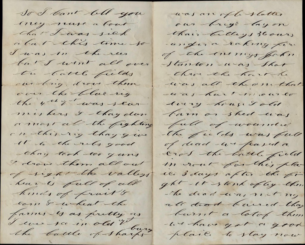 On the 19th we marched over the battleground. It was a horrible sight. The dead were not yet buried. The fields and woods were laying full of them, their faces all swollen and black. War is a dreadful and horrible thing. May it soon be over. We have been encamped near Sharpsburg for the last ten or twelve days. We don’t know when we will leave this but I don’t think it will be long before we leave this. We live pretty well here, has plenty of good water which we don’t have all the time. I have got to like soldiering pretty well.