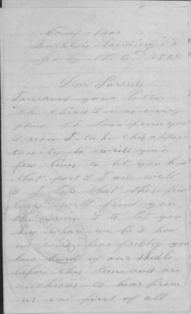 Saturday, August 23, 1862—Am on guard today. Our stacks being right on the edge of the bluff. The sea breezes wafted o’er the “Roads” are a luxury well worth enjoying. It is indeed pleasant to sit on the bluff. The salt water foaming on the beach below making music melodious to the ear—the zephyrs playing with the sea air—while the broad expanse of water the shipping on its bosom and the landscape around found a panorama equally grateful and pleasing to the eye. We received a large mail today which had been waiting on us nearly a week. I got four letters—one from home, [ ], M. R., & sister M. J. P. The boys are fishing for crabs in the river today.