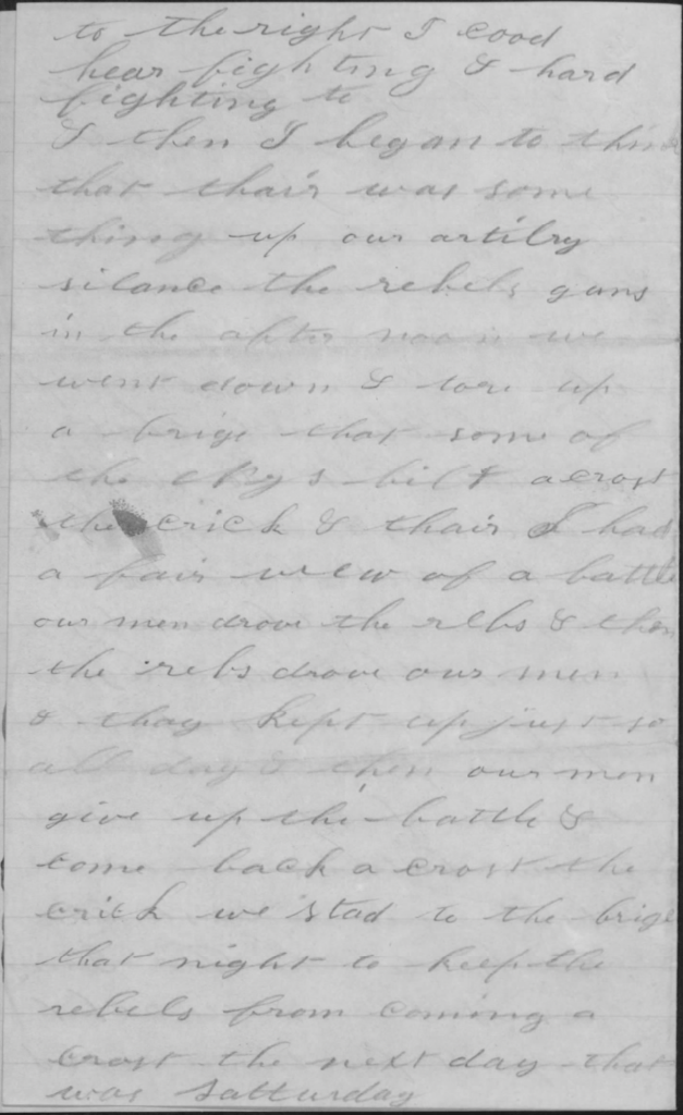 Our Brigade was drawn in line of battle and advanced toward them. We had a pretty sharp time for about an hour when fresh troops were brought up and we were withdrawn from the field and did no more fighting that day. We only lost a few men in our regiment. The battle continued all day without intermission. 2 The rebels fought bravely but could not stand the Yankees. In the night and the next day they got away as fast as they could and got over into Virginia again.