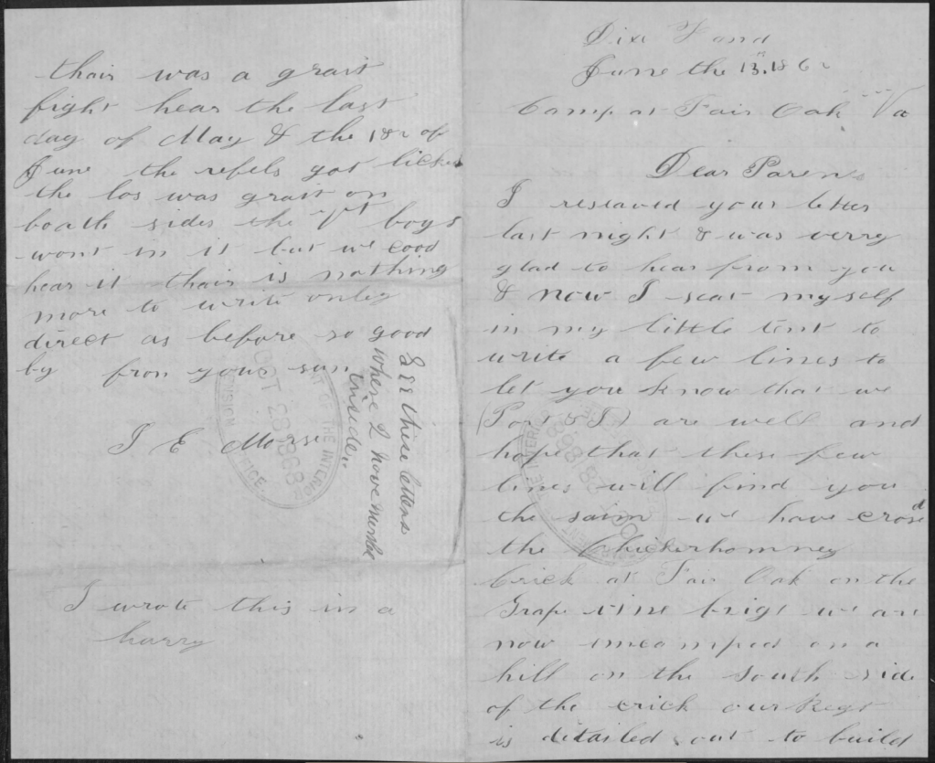 Well, I almost forgot to tell you that I ran across the 137th Pennsylvania Reserves and saw all the boys. They were burying the dead. I suppose they will send you all particulars. I also saw several of the 45th today. None of the boys from Equinunk got killed. Several got wounded.