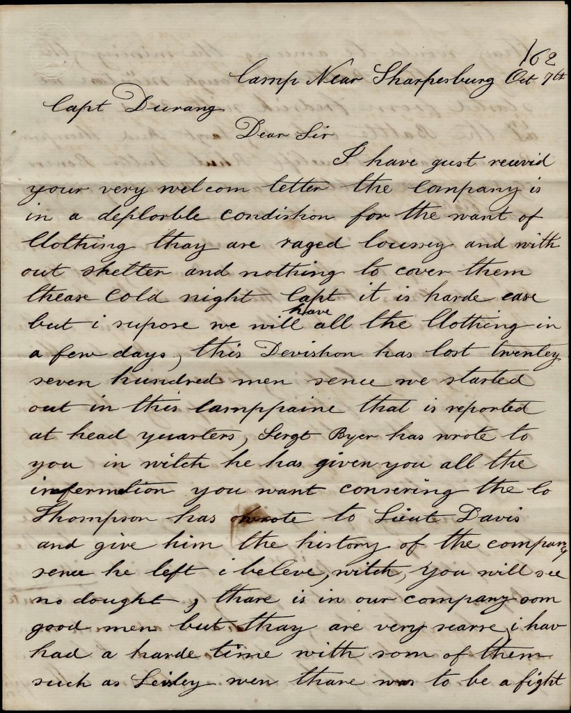 Dear Sir—I have just received your very welcome letter. The company is in a deplorable condition for the want of clothing. They are ragged, lousy, and without shelter and nothing to cover them these cold nights. Captain, it is [a] hard case. But I suppose we will have all the clothing in a few days.