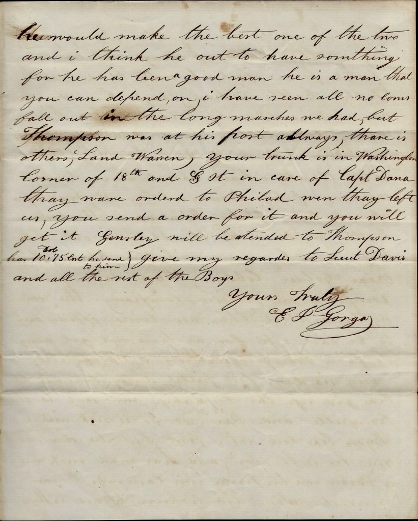 Your trunk is in Washington, corner of 18th & G Street in care of Capt. Dana. They were ordered to Philadelphia when they left us. You send an order for it and you will get it. Generally will be attended to. Thompson has got 10 dollars 75 cents he sent to him. Give my regards to Lieut. Davis and all the rest of the boys,