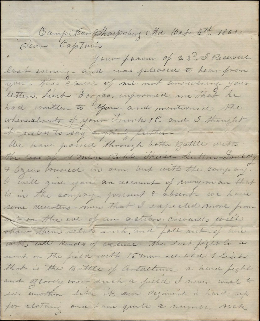 We have passed through both battles [S. Mountain & Antietam] with the loss of 4 men—[John] Ruhl, [Augustus M.] Theiss, [George W.] Sutton, and [James H.] Gouldy, & [Albert] Ozias bruised in arm but with the company. I will give you an account of every man that is in the company—present and absent. We have some deserters—men that I expected more from but on the eve of an action, cowards will show themselves such and fall out of line with all kinds of excuse. The last fight, Co. A went on the field with 15 men all told [and] 1 Lieutenant—that is, the Battle of Antietam. A hard fight and bloody one—such a field I never wish to see another like it.