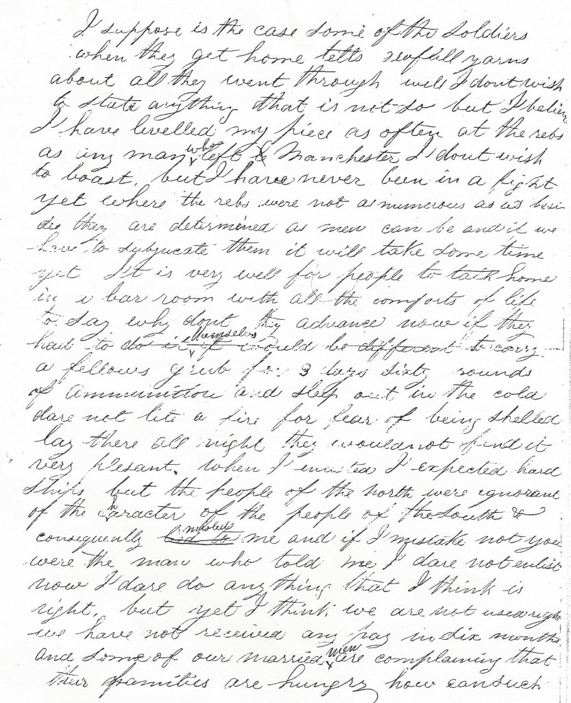 Now Charley, I want to write you a word or two and I don’t wish you to let everyone know it for as I suppose is the case, some of the soldiers, when they get home, tells awful yarns about all they went through. Well, I don’t wish to state anything that is not so. But I believe I have leveled my piece as often at the rebs as any man who left Manchester. I don’t wish to boast but I have never been in a fight yet where the rebs were not as numerous as us. They are determined as men can be and if we have to subjugate them, it will take some time yet. It is very well for people to talk home in a bar room with all the comforts of life to say, “Why don’t they advance now?” If they had to do it themselves, it would be different. To carry a fellow’s grub for three days, sixty rounds of ammunition and sleep out in the cold, dare not light a fire for fear of being shelled, lay there all night, they would not find it very pleasant.