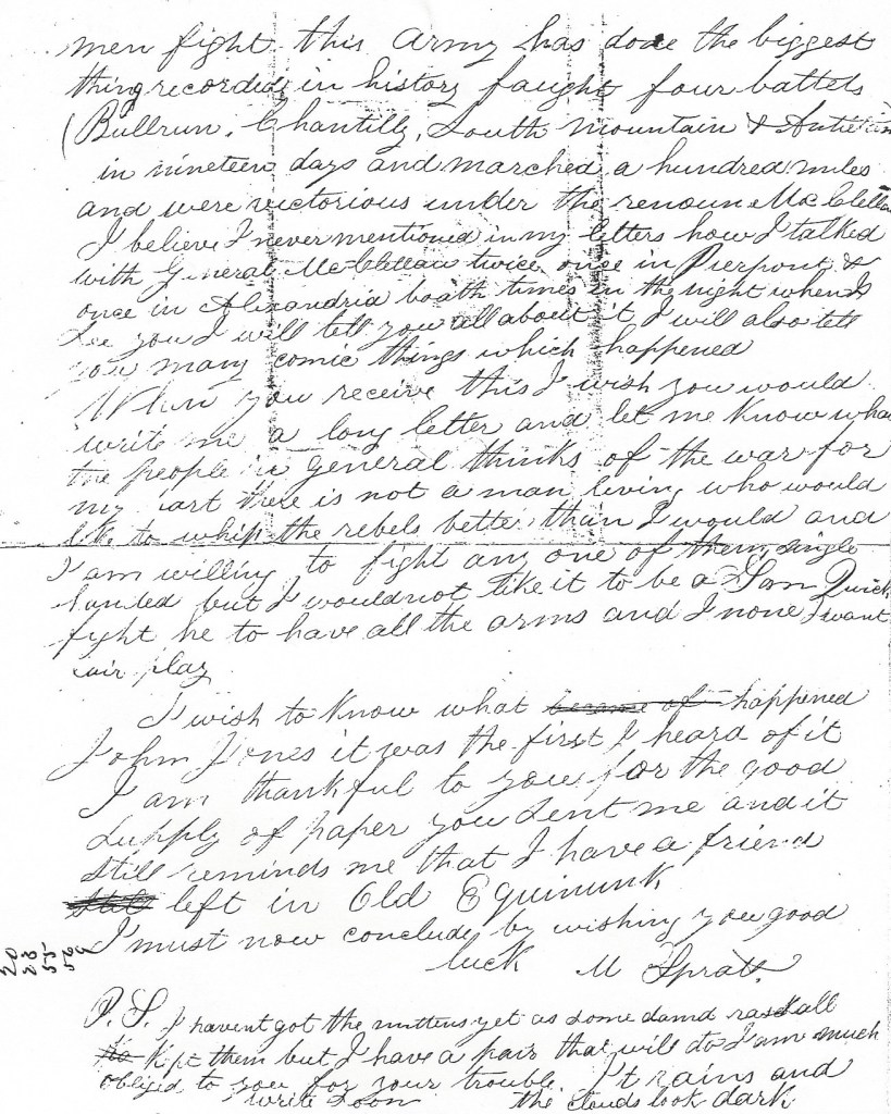 When I enlisted, I expected hardships but the people of the North were ignorant of the character of the people of the South and consequently misled me and if I mistake not, you were the man who told me I dare not enlist. Now I dare do anything that I think is right, but yet I think we are not used right. We have not received any pay in six months and some of our married men are complaining that their families are hungry. How can such men fight? This army has done the biggest thing recorded in history—fought four battles (Bull Run, Chantilly, South Mountain & Antietam) in 19 days and marched a hundred miles and were victorious under the renowned McClellan. I believe I never mentioned in my letters how I talked with General McClellan twice—once in Pierpont & once in Alexandria, both times in the night. When I see you, I will tell you about it. I will also tell you many comic things which happened.