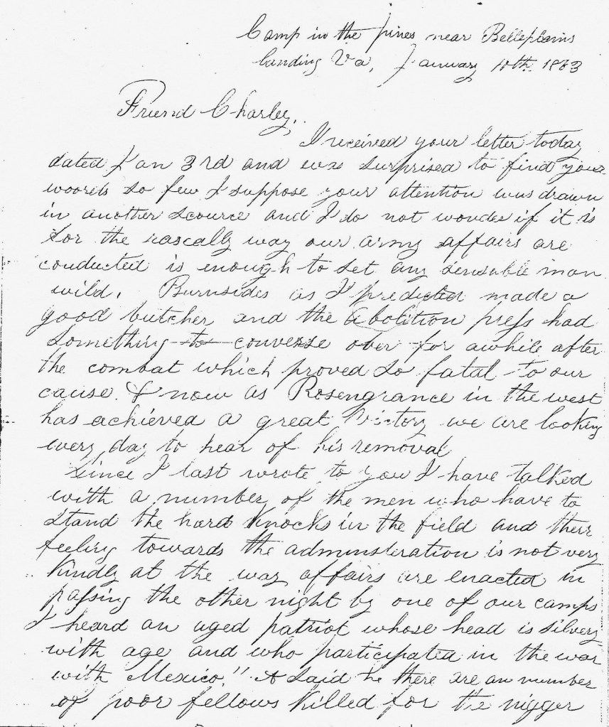 I received your letter today dated January 3rd and was surprised to find your words so few. I suppose your attention was drawn in another source and I do not wonder if it is for the rascally way our army affairs are conducted in enough to let any sensible man wild. Burnsides as predicted made a good butcher and the abolition press had something to converse over for a while after the combat which proved so fatal to our cause. And now as Rosecrans in the West has achieved a great victory, we are looking every day to hear of his removal.