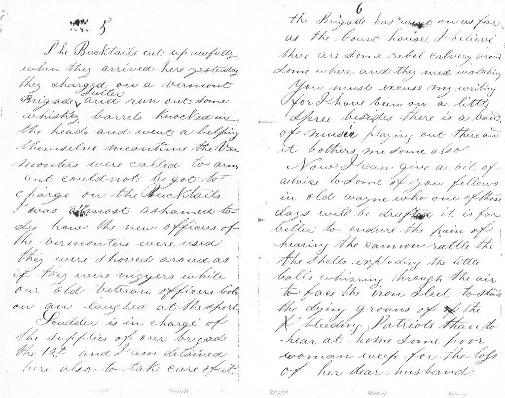 ….The Bucktails cut up awfully when they arrived here yesterday. They charged on a Vermont Brigade Sutler and run out some whiskey barrels, knocked in the heads, and went a helping themselves. Meantime the Vermonters were called to arms but could not be got to charge on the Bucktails, I was almost ashamed to see how the new officers of the Vermonters were used. They were shoved around as if they were niggers while our old vetran officers looked on and laughed at the sport.