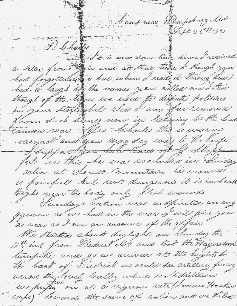 I suppose you have heard of G[eorge] Shopp’s fate ere this. He was wounded in Sunday action at South Mountain. His wound is painful but not dangerous. It is in both thighs near the body—only flesh wounds.