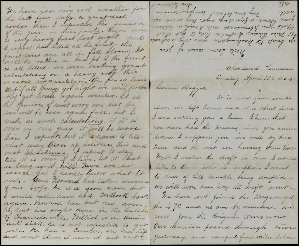 We have had very cool weather for the last few days—a great deal cooler than I expected this season of the year in these parts. There was a very heavy frost last night and I expect has killed all the fruit. The fruit trees are all in full bloom. It will be rather a bad job if the fruit is all killed. We were making great calculations on a heavy crop this season—especially in the peach trees. But if all things go right, we will probably get home again by winter. It is the opinion of most everyone that the war will be over again fall, but I make no such calculations. If it is over in one year, it will be more than I expect. But it is hard to tell what may turn up between this and next Christmas. I expect to stay till it is over—if I live, let it last as long as it will.