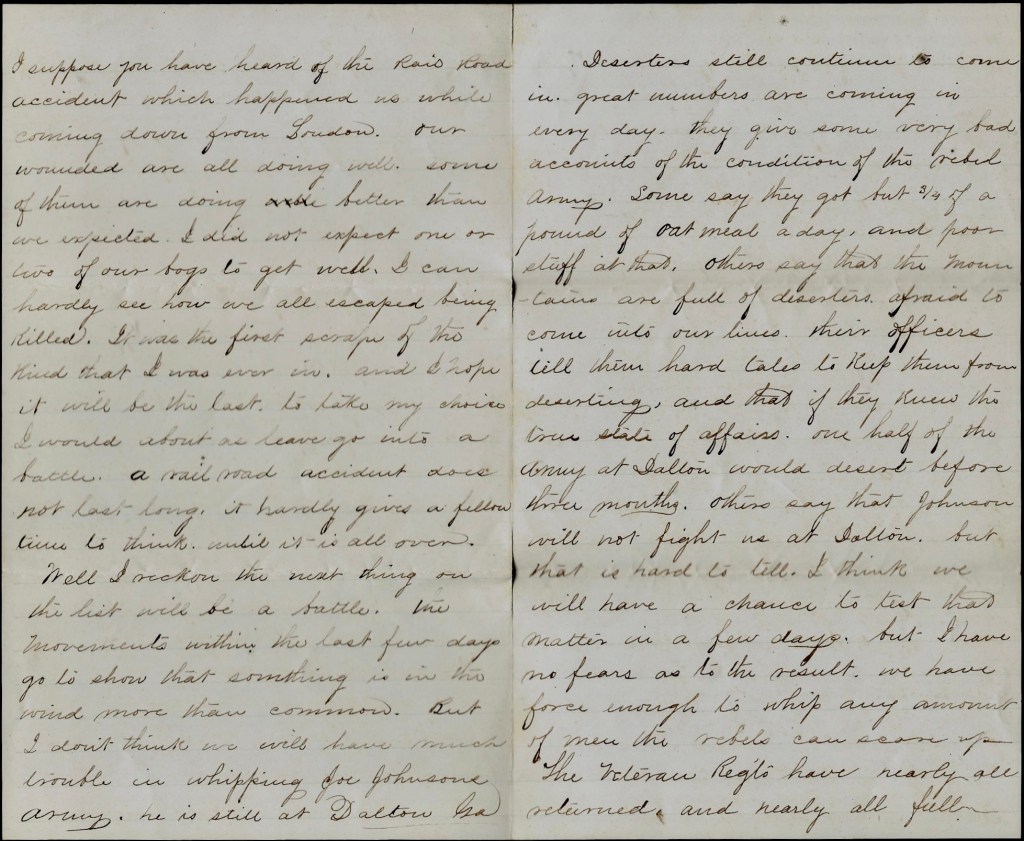 Well, I reckon the next thing on the list will be a battle. The movements within the last few days go to show that something is in the wind more than common. But I don’t think we will have much trouble in whipping Joe Johnston’s Army. He is still at Dalton, Georgia. Deserters still continue to come in. Great numbers are coming in everyday. They give some very bad accounts of the condition of the rebel army. Some say they got but three-quarters of a pound of oat meal a day and poor stuff at that. Others say that the mountains are full of deserters afraid to come into our lines. Their officers tell them hard tales to keep them from deserting, and that if they knew the true state of affairs, one half of the army at Dalton would desert before three months. Others say that Johnston will not fight us at Dalton, but that is hard to tell. I think we will have a chance to test that matter in a few days, but I have no fears as to the result. We have force enough to any amount of men the rebels can scare up. The veteran regiments have nearly all returned and nearly all full.