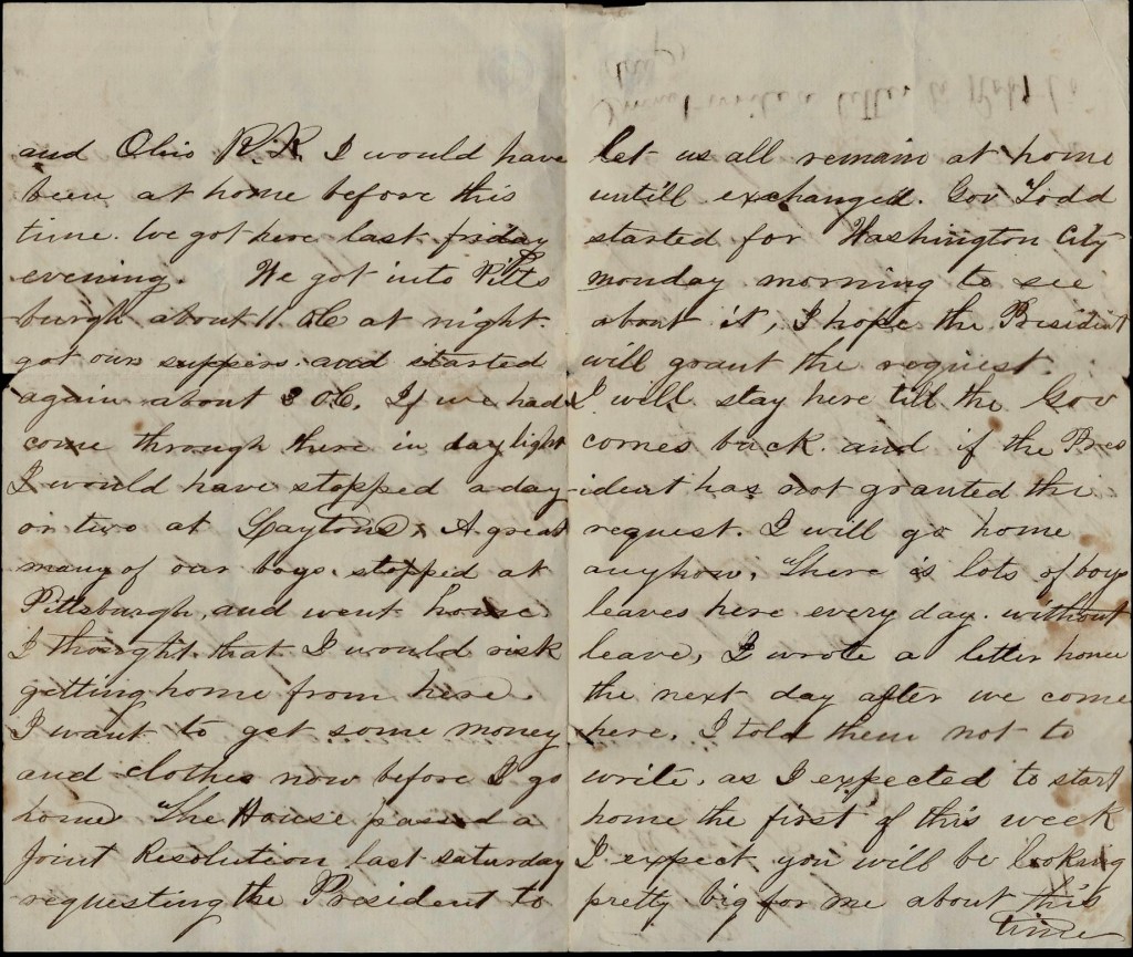 The House passed a joint resolution last Saturday requesting the President to let us all remain at home until exchanged. Gov. Todd started for Washington City Monday morning to see about it. I hope the President will grant the request. I will stay here till the Governor comes back and if the President has not granted the request, I will go home anyhow. There is lots of boys leaves here every day without leave.