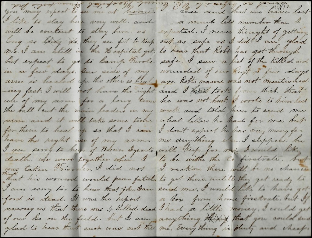 I am sorry to hear of [John] Brown Dysart’s death [on 15 January 1863]. We were together when I was taken prisoner. I did not think that his wound would prove fatal. I am sorry too to hear that John [W.] Danford is dead. It was the report among us that there was four killed dead of our company on the field, but I am glad to hear that such was not the case and that we have lost a much less number than I expected. I never thought of getting out as safe as I did. I am glad to hear that [cousin] Robert has got through safe. I saw a list of the killed and wounded of our regiment a few days ago. Robert’s name was not mentioned and I took from that that he was not hurt. I wrote to him last week and told him to send me what letters he had for me but I don’t expect he has very many for me. Anything else, I suppose, he will keep for me.