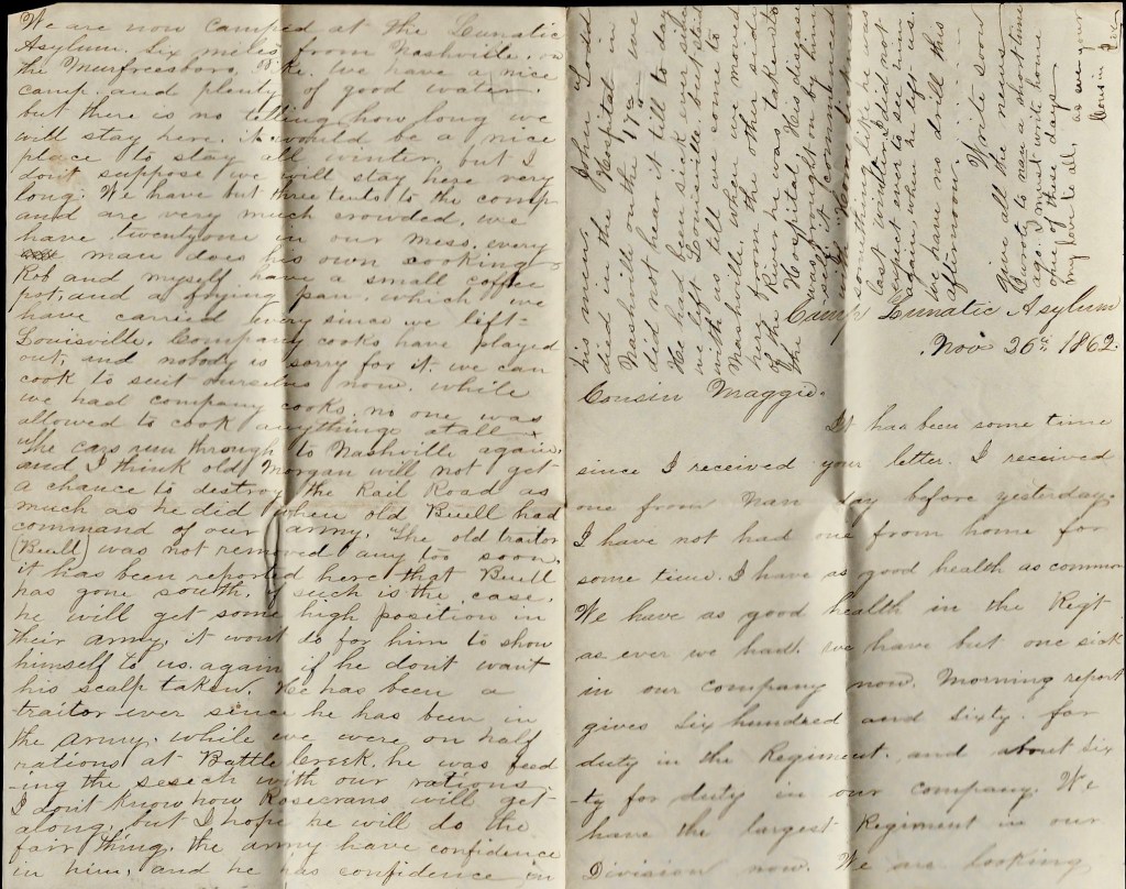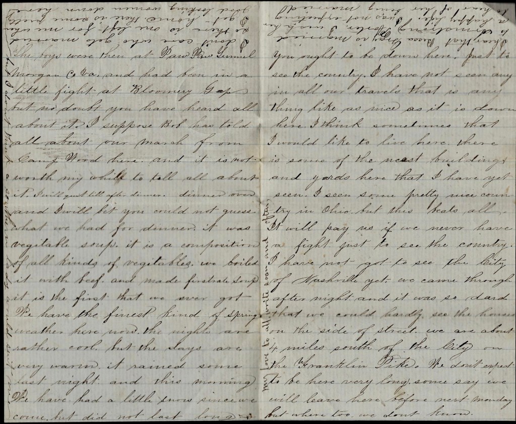 I suppose you have heard before this that I am again with the regiment. I have wrote one letter home since I came back which I suppose they have got by this time. We left Camp Chase on the 2nd, run down to Cincinnati on the cars, then on a boat to Louisville. We got to Louisville on Wednesday about noon, had to lay over there until Friday morning, got to Nashville on Friday night, and went to the barracks. Left Nashville on Saturday morning (this day week ago), [and] arrived here about 10 o’clock.