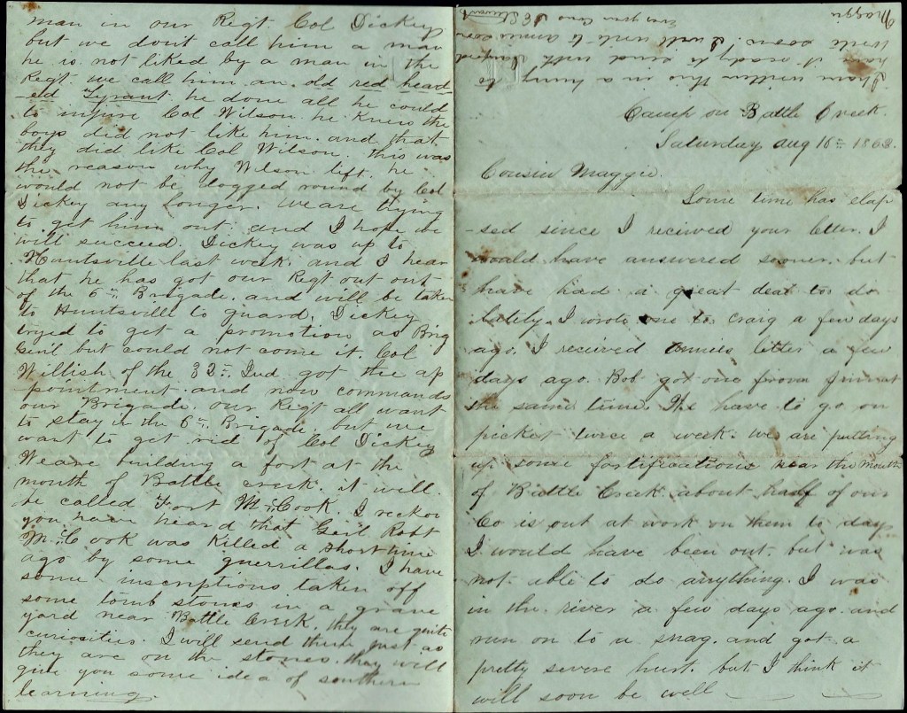 I want you to send me a newspaper pretty soon. We are near the River Tallahatchie and when we got to Wyatt, the Rebels had destroyed the ferry and we had to build a bridge and ten of our company were detailed to cut logs that night from 7 til 9 o’clock. So I claim a share in the great Tallahatchie Poltroon Bridge, for I was one of the ten detailed.