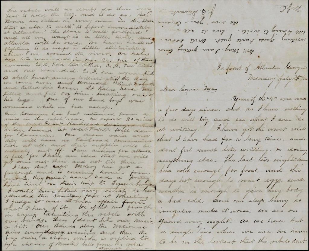 The rebels will no doubt do their very best to hold the city and to do so, Governor [Joseph E.] Brown has called on every man in the state that is able to walk to report immediately to Atlanta. The place is well fortified and all we want is a little time and Atlanta will be ours. We have had no fighting to do except a little skirmishing since we crossed the river. We have had some wounded in our company—one of them severe. Co. K had two killed, Co. B one killed and one wounded, Co. I one wounded. A shell burst among Willich’s staff the day we came here and wounded Lieut. Magrath and killed his horse. Lieut. Kaler’s horse was killed and fell on him, breaking one of his legs. One of our band boys was wounded while in bed asleep.