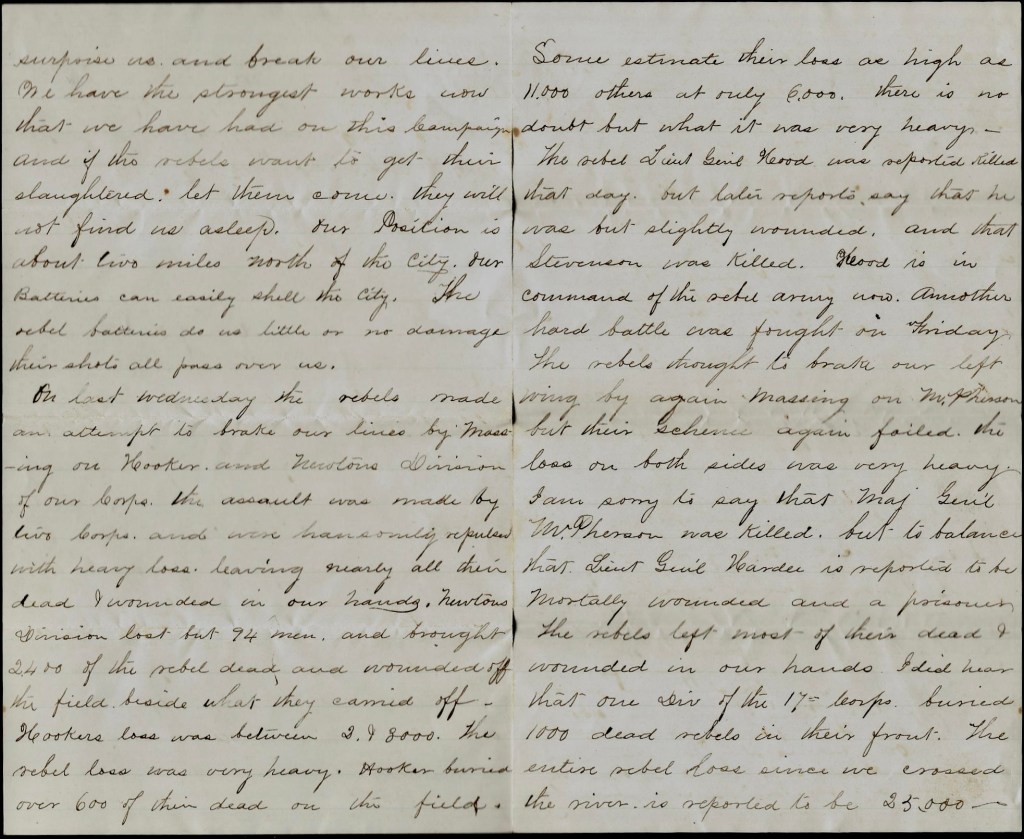 On last Wednesday [See Battle of Peachtree Creek, 20 July] the rebels made an attempt to break our lines by massing on Hooker and Newton’s division of our corps. The assault was made by two corps and were handsomely repulsed with heavy loss, leaving nearly all their dead and wounded in our hands. Newton’s division lost but 94 men and brought 2400 of the rebel dead and wounded off this field besides what they carried off. Hooker’s loss was between 2 & 3,000. The rebel loss was very heavy. Hooker buried over 600 of their dead on the field. Some estimate their loss as high as 11,000; others at roughly 6000. There is no doubt but what it was very heavy. The rebel Lieut. General Hood was reported killed that day, but later reports say that he was but slightly wounded and that Stevenson was killed. Hood is in command of the rebel army now.