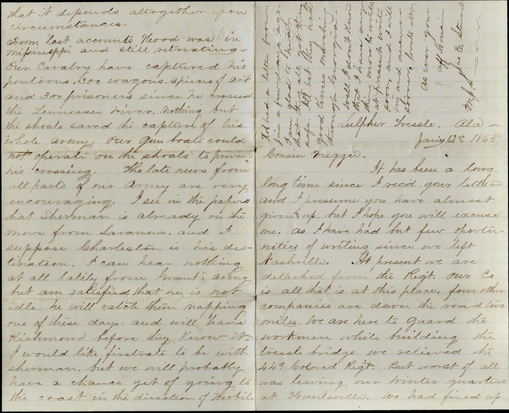 It has been a long long time since I received your letter and I presume you have almost given up. But I hope you will excuse me as I have had but few opportunities of writing since we left Nashville. At present, we are detached from the regiment. Our company is all that is at this place. Four other companies are down the road two miles. We are here to guard the workmen while building the trestle bridge. We relieved the 44th Colored Regiment. But worst of all was leaving our winter quarters at Huntsville. We had fixed up good quarters and were about fixed for living. But to our disappointment, we were waked up at 4 o’clock yesterday morning with orders to move at half past 5 o’clock. T’was then the general inquiry, “where are we going?” but no one could tell farther than that we were going on the cars. But after marching into town, we found that we were coming here.