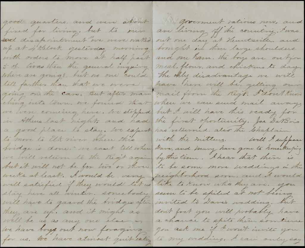 We stopped in Athens last night and had a good place to stay. We expect to move to Elk River when this bridge is done. We can’t tell when we will return to the regiment again but it will not be for two or three weeks at least. I would be very well satisfied if they would let us stay here all winter. Somebody will have to guard the bridges after they are up and it might as well be us as anyone else.