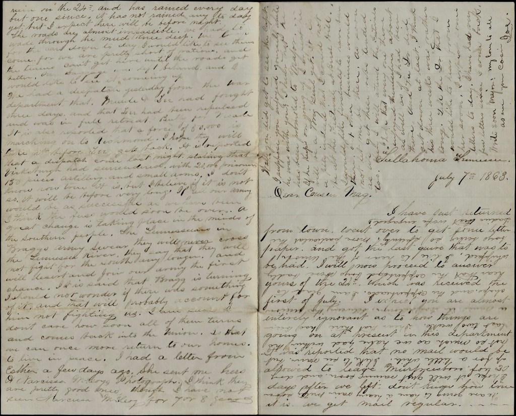 We had a dispatch yesterday from the War Department that Meade & Lee had fought three days and that Lee had been repulsed and was in full retreat. Bully for Meade. It is also reported that a force of 50,000 is marching on to Richmond. I hope they will take it before Lee get back. It is reported that a dispatch come last night stating that Vicksburg had surrendered with 20,000 prisoners, 150 pieces of artillery and small arms. I don’t know how true it is, but believe if it is not so, it will be before very long. If all our army would be as successful as we have been, I think the fuss would soon be over. A great change is taking place in the minds of the Southern people. The tennesseans in Bragg’s army swear they will never cross the Tennessee River. They say that they will not fight for the South any longer and will desert and join our army the first chance. It is said that Bragg is turning. I should not wonder if there was something of it and that will probably account for him not fighting us. I am sure I don’t care how soon all of them turns and comes back into the Union so that we can once more return to our homes to live in peace.