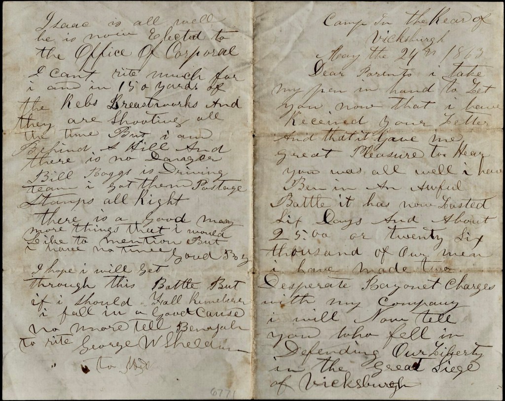 I don’t know where we are going to but think we are going to Vicksburg and fight them there after we get done with them here. And from Vicksburg down the river till the thing is settled which all the old soldiers think will be done in a short time. We have got quite a piece of Uncle Sam’s family here, for it covers some 4 miles in a square and numbers about 60 or 70 thousand men.